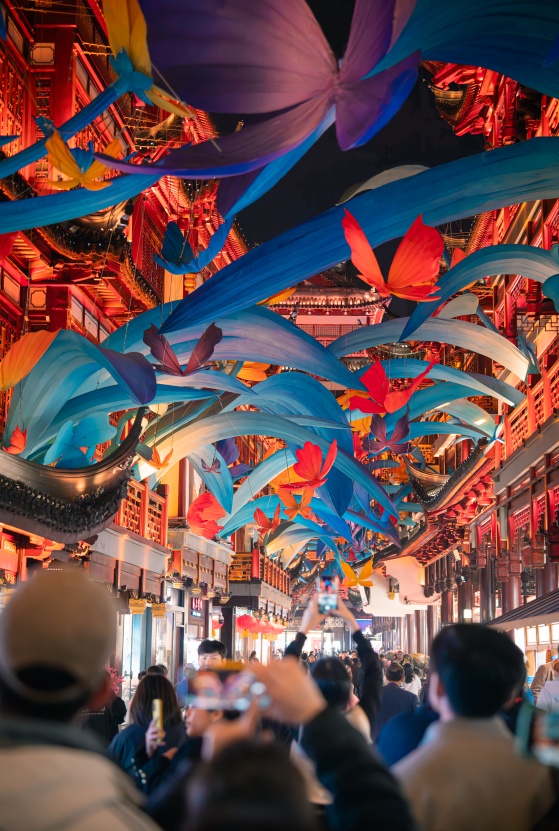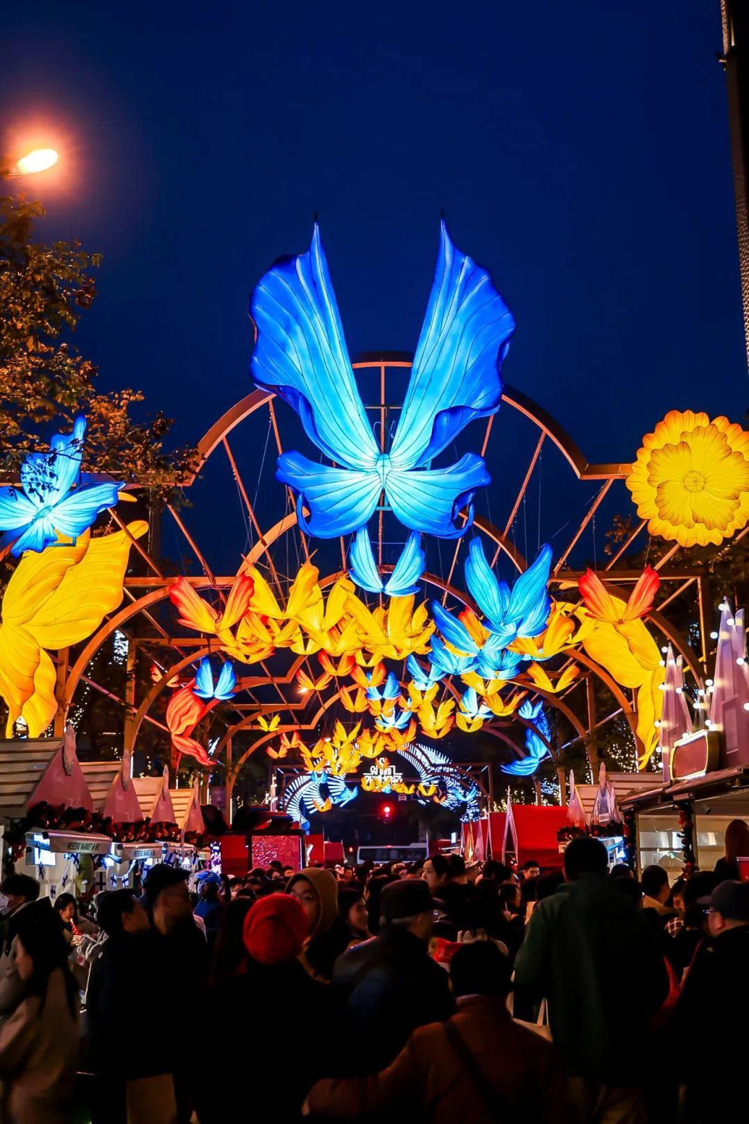 蛇年豫园灯会的光彩闪耀范围也更为广阔,2024年12月8日,与豫园凝晖路同款的“庄周梦蝶”灯组,在bfc枫泾路率先点亮,这也是bfc首次以灯彩装扮新年,冬日梦幻图景中,东方魔幻神话与西方魔法故事在此交汇,串联大豫园文化片区的璀璨风景线。