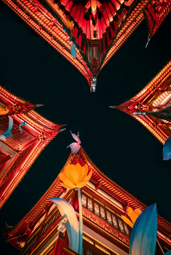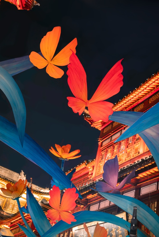 走进黄金广场,生长着一颗生命之树,众多生物栖息于此,展现人与自然、万物共生的亲密关系。凝晖路化身蝴蝶谷,营造出“逍遥物外,庄周梦蝶”的梦境,表达《庄子·齐物论》中所蕴含的万物美好、和合共生、齐物齐论、天人合一的普世价值观。中心广场呈现“天地人和,金蛇献瑞”的热闹丛林景象,灵蛇、蘑菇、小菌人,形成了一幅不同以往的自然愉悦之景。走进九曲桥,仿佛走进“丛林乐园”,潺潺的流水声和生灵的鸣叫交织出生命的旋律,丛林氛围弥漫青草香和花香,展现一幅绚丽而生机勃勃的画卷。豫园老街展现豫园灯会30年的灯彩历程,从中国十大灯彩流派中,选其经典造型精细还原,营造出“花市灯如昼”的沉浸感。