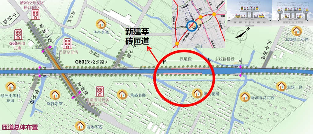 本工程位于松江区新桥镇g60沪昆高速公路(莘砖公路-沪亭路),西起闵松公路/莘砖公路交叉口西侧约150米处,新建平行式上下匝道1对,匝道规模采用2车道。同步拓宽改建地面闵松公路(匝道落地点-莘砖公路),建设规模由现状双向4车道拓宽为双向8车道。同时对横向道路莘砖公路、莘松路、中心路进行改建,闵松公路/莘砖公路、闵松公路/中心路交叉口进行渠化改造。