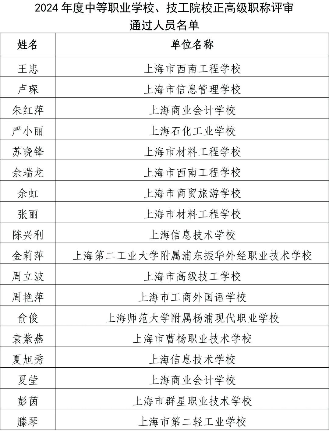 根据《上海市中等职业学校、技工院校教师高级职称评审办法》(沪人社专﹝2021﹞472号),现定于2024年12月18日至12月24日,对2024年度中等职业学校、技工院校正高级职称评审通过人员名单进行公示。