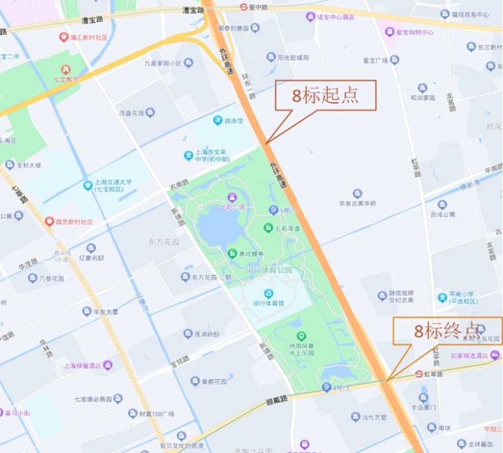 8标段位于闵行体育公园东侧,自农南路北侧至顾戴路南侧,全长约1.79千米,主要施工内容包括新建主线高架桥、1对平行匝道、地面道路系统、配套桥涵、排水工程以及标段内的照明、交安、声屏障等附属工程的预埋管件等。此次,首件钢管桩施工靠近顾戴路跨线桥下最北侧。