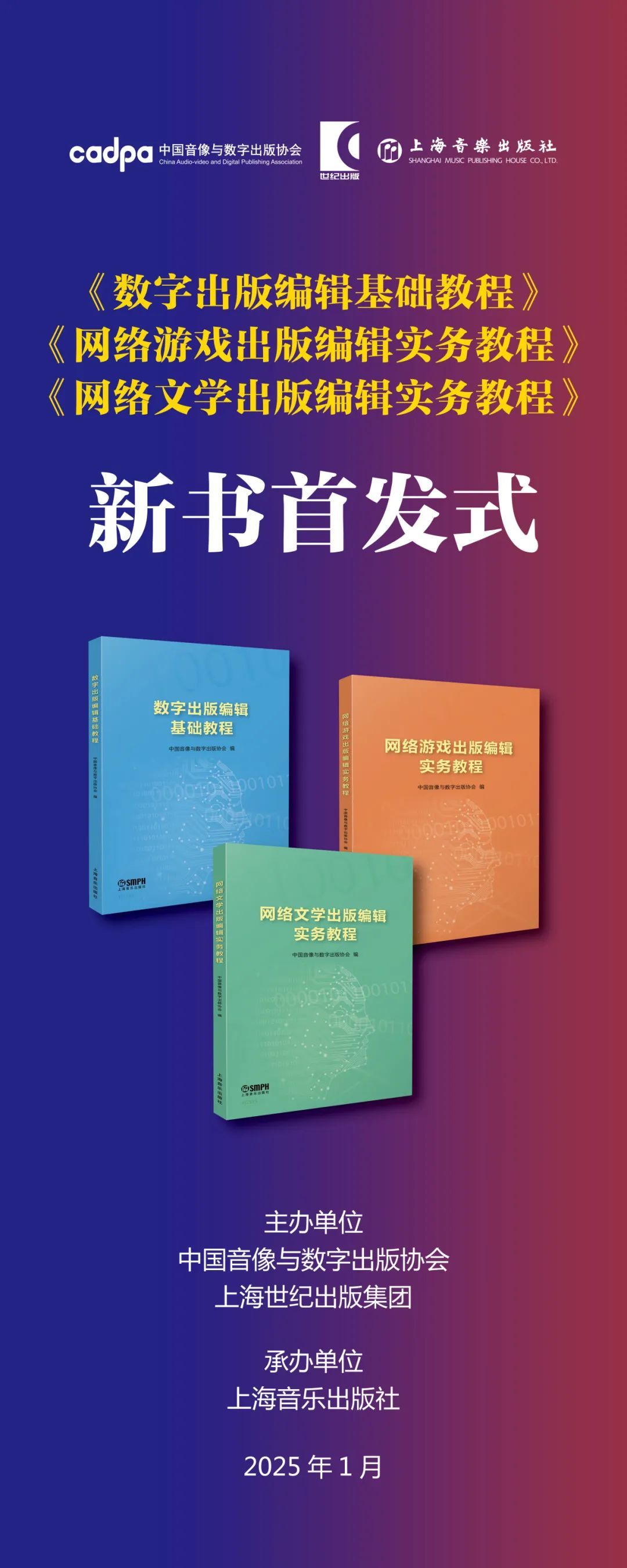 1月10日下午,“《数字出版编辑基础教程》《网络文学出版编辑实务教程》《网络游戏出版编辑实务教程》新书首发式”将在北京东方茂酒店隆重举行,活动由中国音像与数字出版协会、上海世纪出版集团联合主办,上海音乐出版社承办。作为中国音像与数字出版协会组织编写的第一套面向网络文学和网络游戏出版领域从业者岗位能力提升的辅导用书,系列教程的撰写和编辑历时三年,汇聚了80余位主管部门、行业协会及从业单位专家和编写者的心血,围绕政策导向,紧贴业务需求,初步形成了较为科学和完整的知识体系,对推动中国数字出版人才培养和数字出版事业发展具有重要意义。