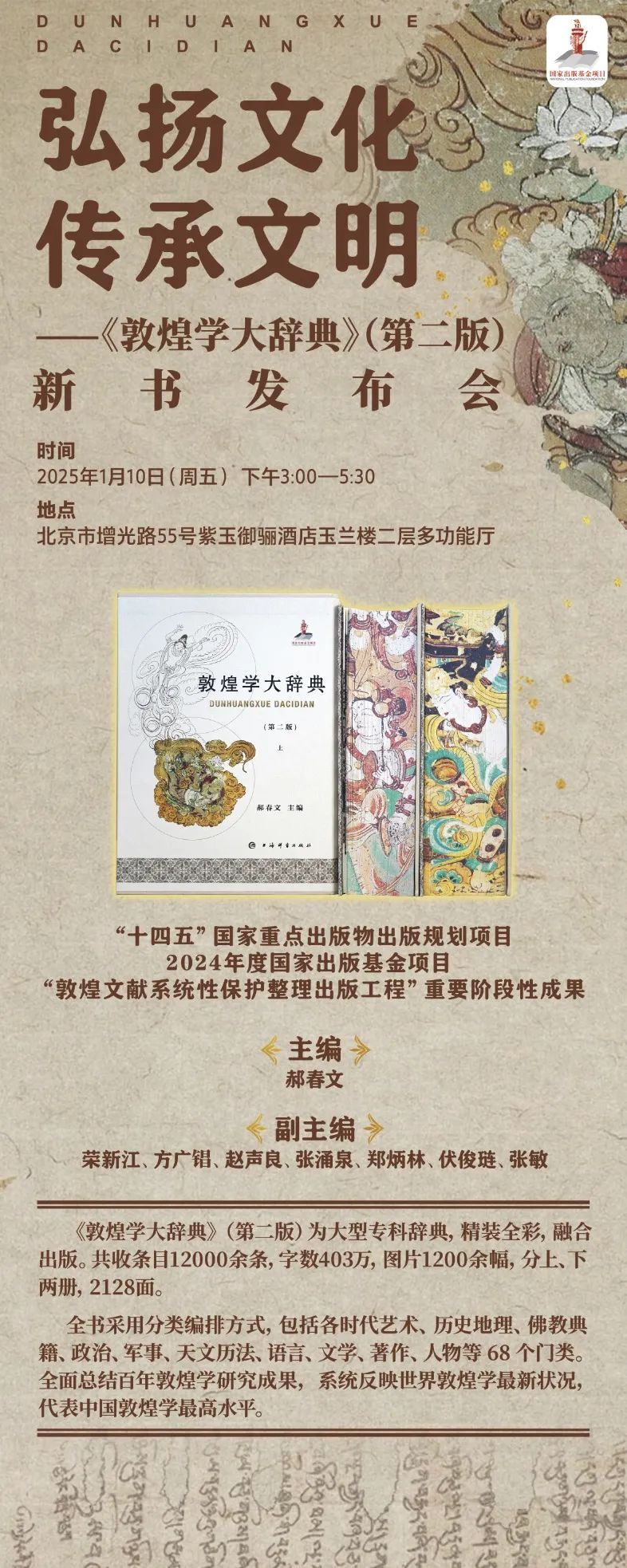 1月10日下午,“《敦煌学大辞典》(第二版)新书发布会”将在北京紫玉御骊酒店举办,是本届订货会上集团的又一重磅活动。“十四五”国家重点出版物出版规划项目、国家出版基金项目《敦煌学大辞典》(第二版)是对季羡林先生任主编的1998年版的继承和发展,修订编纂工作由中国敦煌吐鲁番学会、敦煌研究院、上海辞书出版社共同发起,由时任中国敦煌吐鲁番学会会长郝春文任主编,荣新江、方广锠、赵声良、郑炳林、张涌泉、伏俊琏任副主编,敦煌学界近160位学者参加,历经六年寒暑终于正式出版。新书发布会上,20多位敦煌学专家、学者组成“学术天团”闪耀亮相并作深度发言。