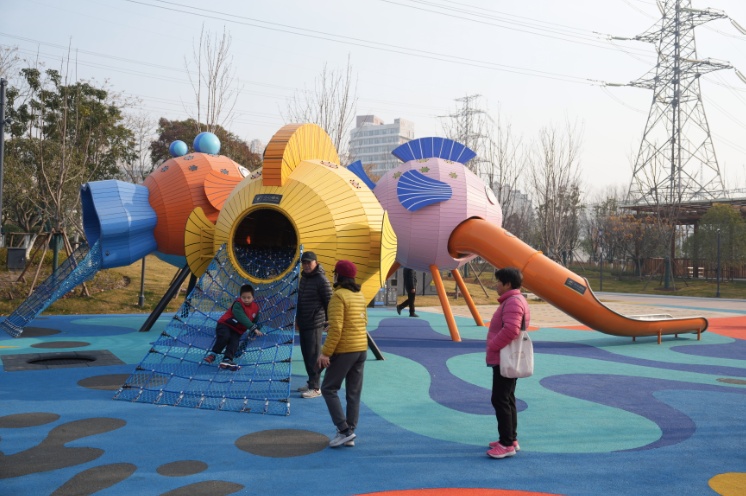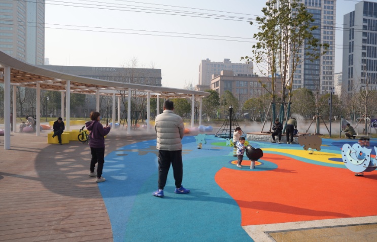 在儿童设施方面,以“一米视角”打造沉浸式儿童友好型乐园,设置塑胶场地、滑梯、攀爬、旱喷等多种无动力游乐设施,编织属于孩子们的童趣。