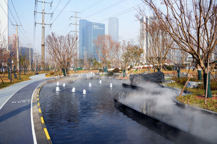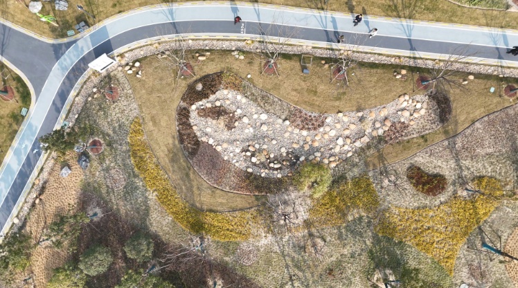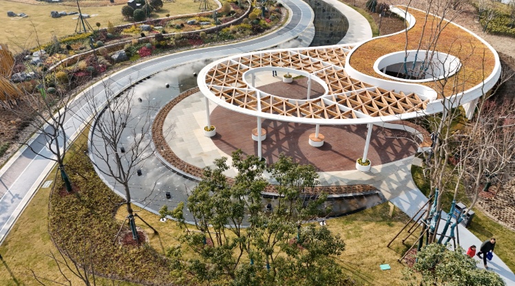 此外,由于武宁公园内水系与外界不连通,并非自然水系,如何确保园内水系生态品质?为此,普陀区绿容局不仅在林语塘设有一处雨水花园,园内不少道路还采用透水材质铺装,并在绿道和下沉式绿地布置生态草沟用于收集雨水,净化初期降雨,将收集的雨水汇入公园内的海绵水系,实现雨水的收集与再利用;搭配水生植物,通过生态种植降低水体含氧,实现生态水景设计的同时雨水管理数据还可根据需求传输至城市云端大数据中,成为智慧城市数据管理的组成部分。
