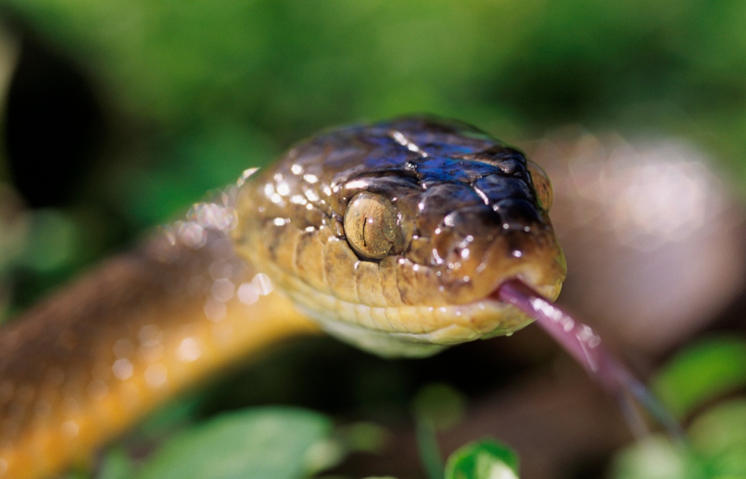 蛇的视力近于零,却能在黑夜里及时发觉并准确捕获几十米外的田鼠、青蛙、 蜥蜴等猎物。科学家们证实,这是因为蛇能借助眼睛与鼻子之间的颊窝进行“热定位”的结果。蛇的嗅觉和味觉器官都在舌头上。舌头伸出时,可以收集空气中的气味粒子;缩进口中后,气味粒子会被传递到犁鼻器中,蛇可由此知晓猎物或敌害的信息,所以蛇要不停地吞吐舌头。舌头分叉是蛇探测距离的需要。举个例子,我们光用一只眼睛看的话,就不容易精确估计距离,而蛇的舌头也要分出两个叉,才能探知猎物或敌害的准确信息。
