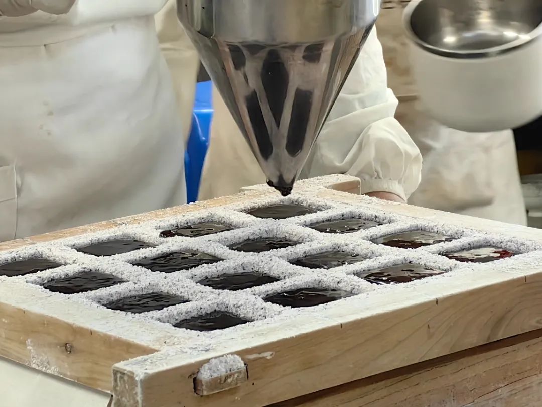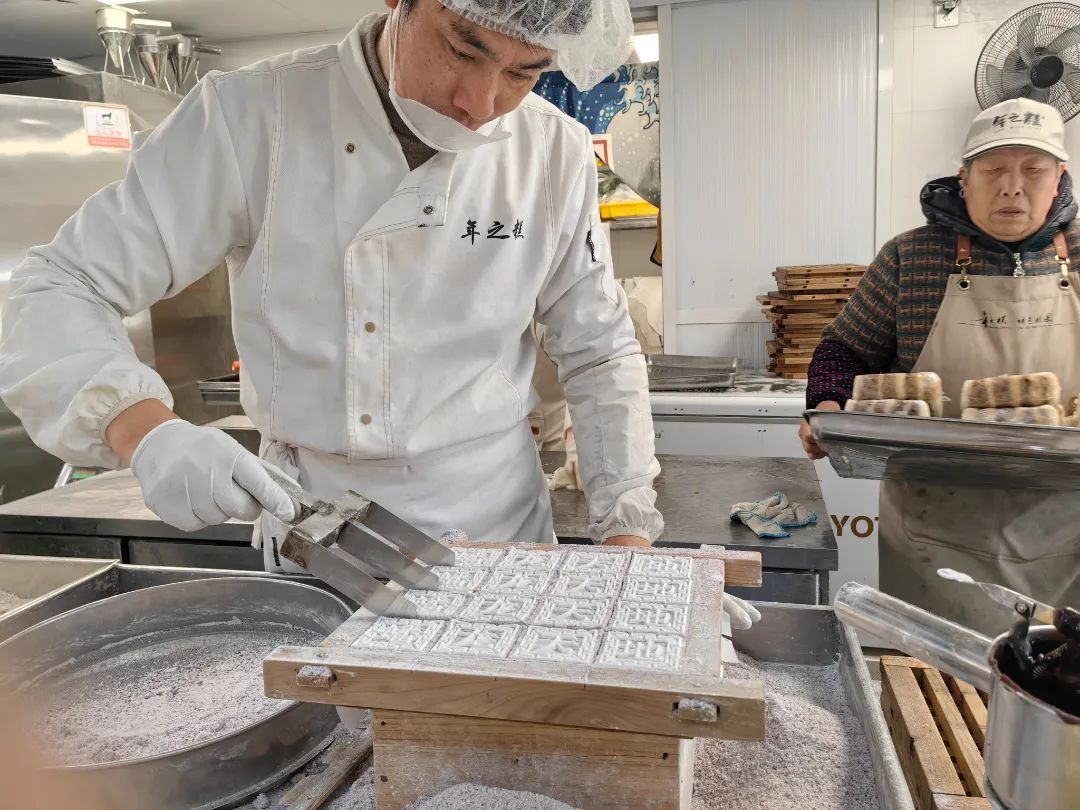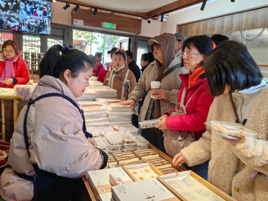 新春佳节,承载着“年年高”美好寓意的“年之糕”店人气爆棚。年糕、方糕、糯米糖糕等各类糕点摆满了货架,游客们边看边选购心仪的口味。操作区内,师傅们手法娴熟地制作着精美的糕点,引得游客饶有兴致地驻足观望:“这个方糕我之前吃过,味道很赞,今天来蟠龙游玩正好买几盒。”