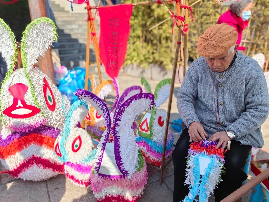 廊桥边,民间艺人现场展示着传统非遗滚灯制作的精湛技艺,游客们目不转睛地观看,不时发出阵阵赞许。“套娃”游戏区同样充满欢声笑语,色彩斑斓的蛇形娃娃整齐排列,吸引着游客们跃跃欲试。年轻人身手敏捷,眼神专注,想一把套住看中的娃娃,孩子们则在一旁加油助威,让简单的游戏充满了浓浓的温情。
