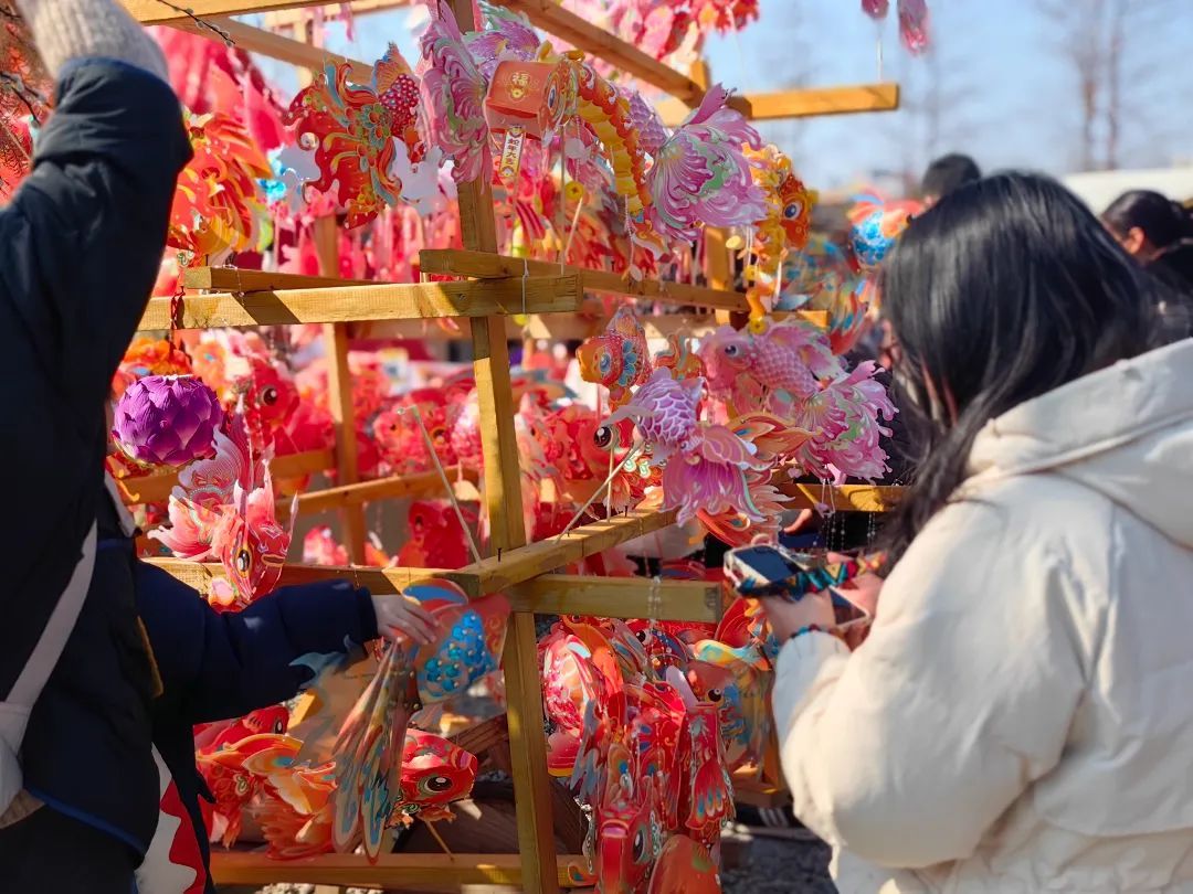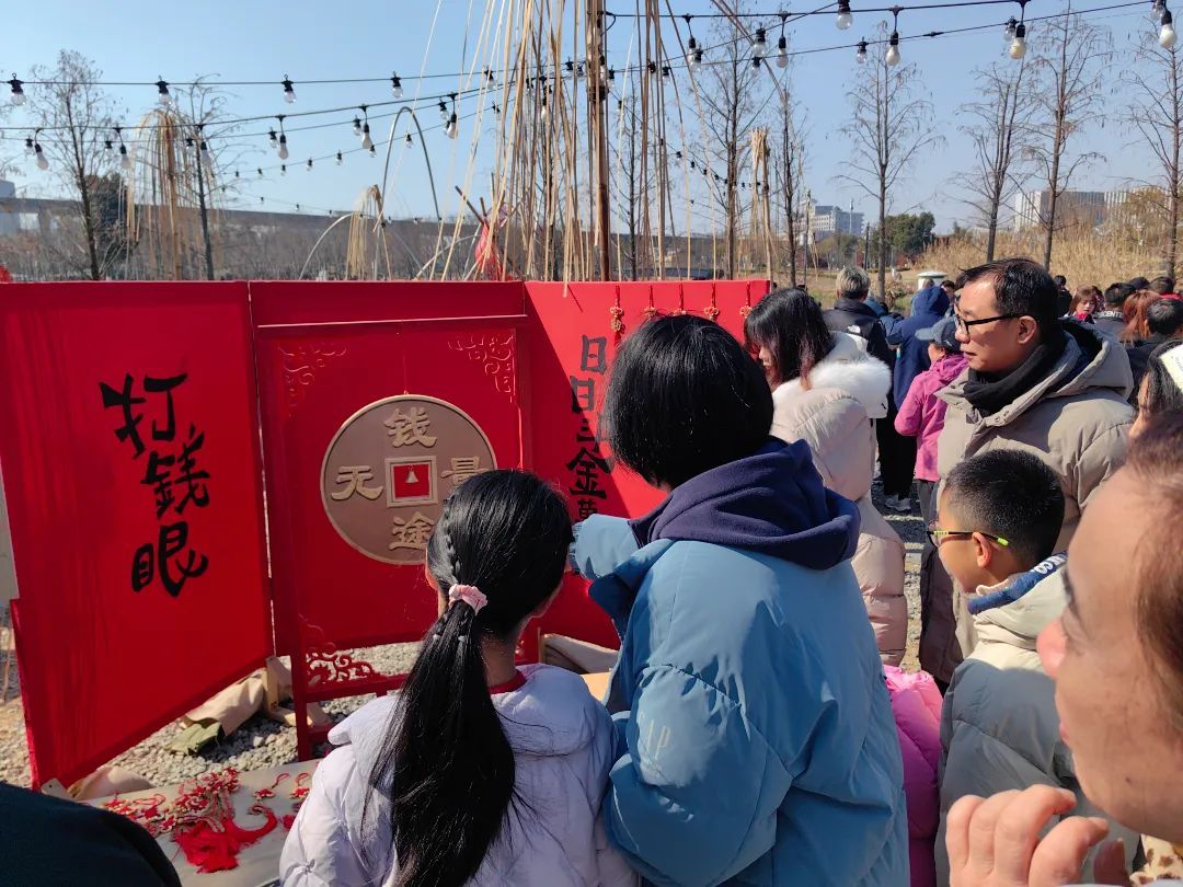 蟠龙水集的传统民俗体验也是年味浓浓。“打钱眼”区域被游客围得水泄不通,只见大家手持特制的铜钱,瞄准不远处高悬的“钱眼”投掷。大家相互打趣,比比谁的手气更好,热闹的场景仿佛穿越回了旧时的市井街巷。