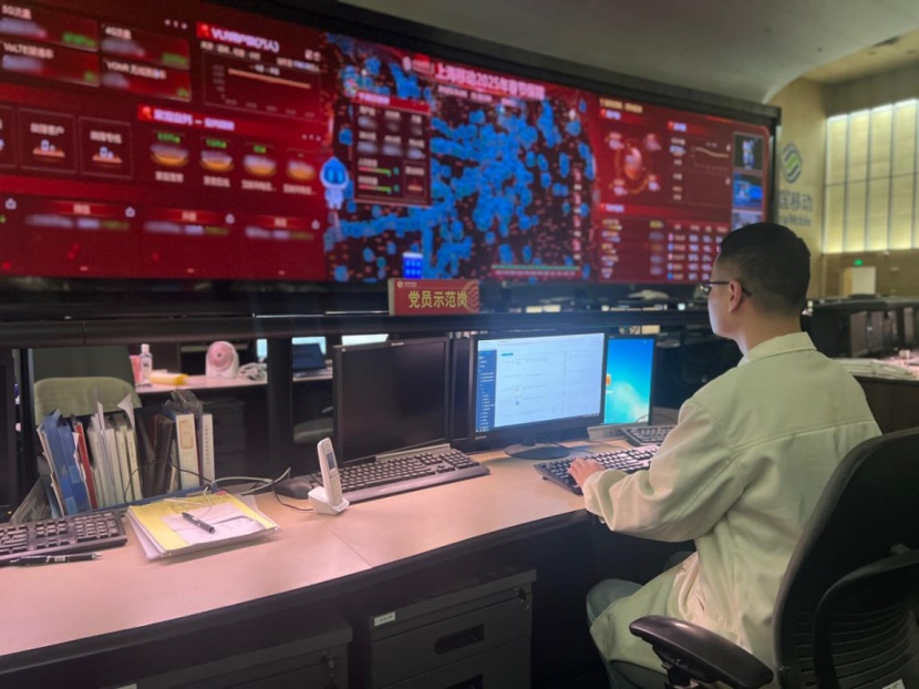 上海移动指挥大屏调整为新春保障模式,值班人员时刻关注各项参数。