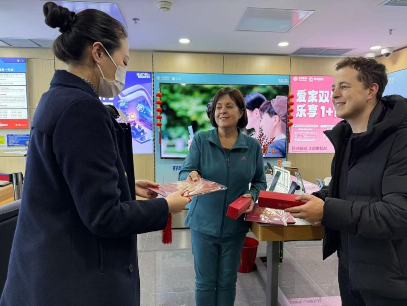 外籍游客卢卡斯及其母亲在中国移动浦东国际机场营业厅收到第一份新春祝福。