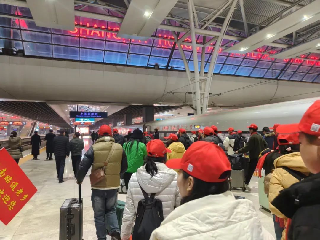 当晚,虹桥站灯火通明,人潮涌动。与出站口相邻的“来沪第一站”大厅内传出了阵阵欢乐的音乐,大红灯笼、新春对联、中国结等新年装饰分外耀眼,三块醒目的红色大屏幕也映入眼帘,上面写着“云南昭通务工者‘点对点’包列返岗欢迎仪式”,处处洋溢着喜庆祥和的暖心氛围,让旅途劳顿的务工人员感受到节日的气氛和上海的热情。