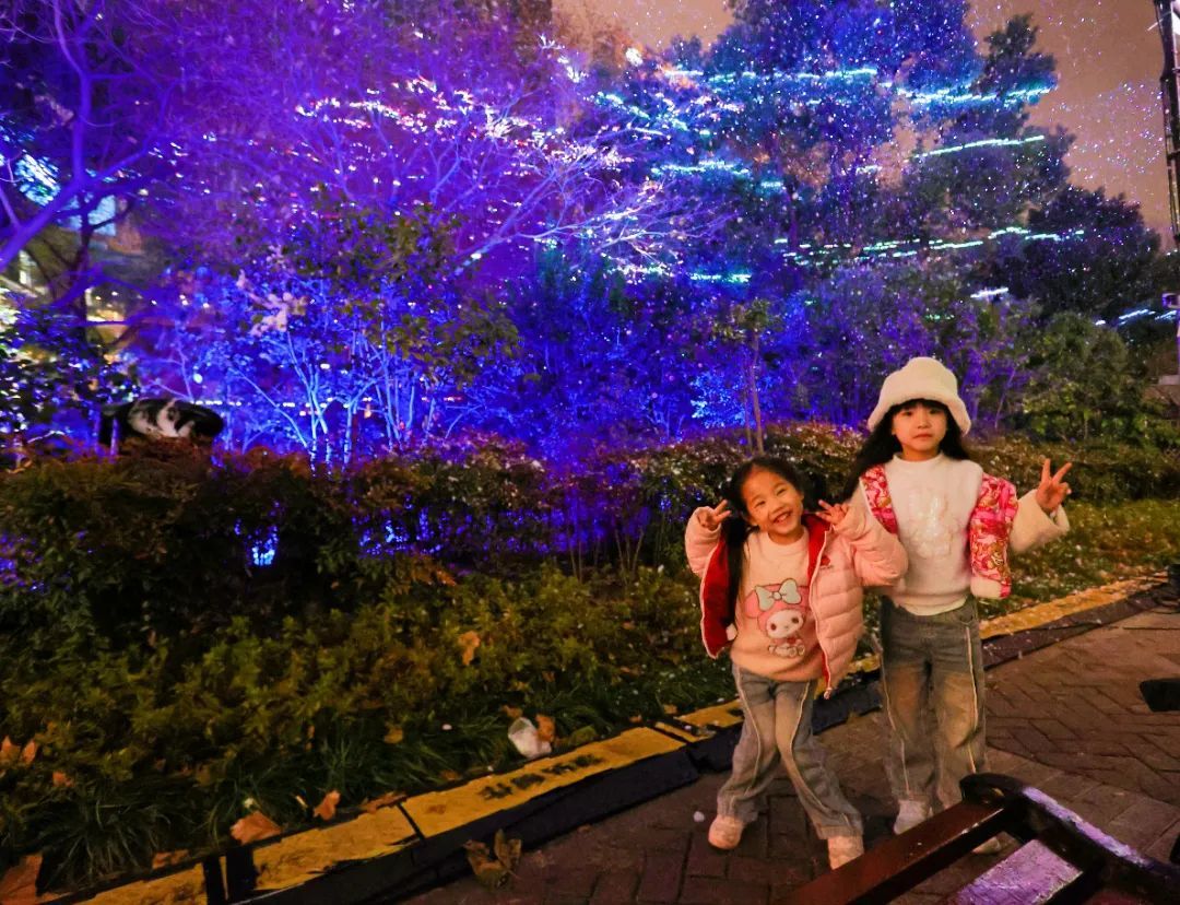 静安公园里,“瑞雪兆丰年”的光影场景与“火树银花”的激光秀交相辉映,满天飞舞的雪花,儿童嬉戏,爱人牵拥,长辈相扶。非遗光影秀《浮光百戏》将繁华静安用海派皮影戏款款道来,共历长河,岁月静好。