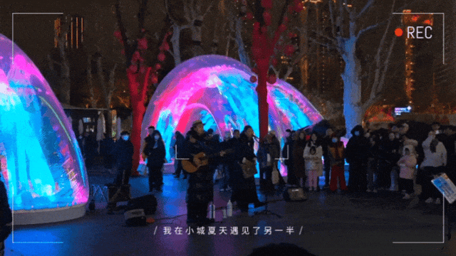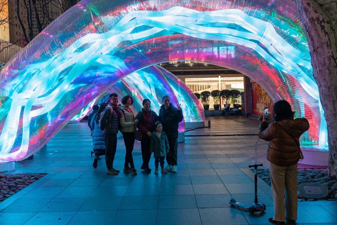 静安公园前,一条霓虹色彩的蛇以拱形姿态伸展,灵动又充满未来科技感。在《蛇影焕彩》的灯光装置下,你可以举起手中相机打卡留念,也可驻足而立,聆听街头艺人们拨弦轻歌,随性挥洒。