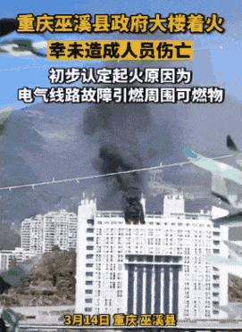 2023年3月14日,四川重庆市巫溪县政府办公楼14楼1403办公室发生火灾,该县消防大队接警后,立即调派消防救援人员前往处置,火灾未造成人员伤亡。据了解,此次起火原因为电气线路故障引燃周围可燃物。