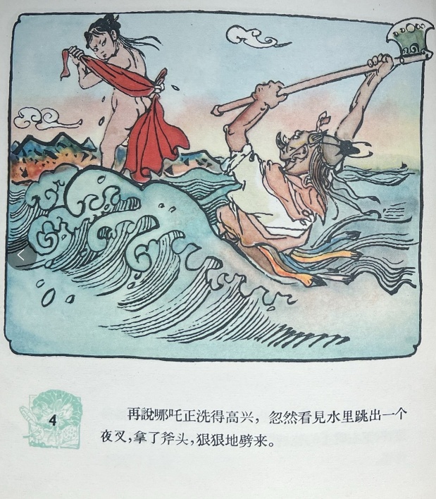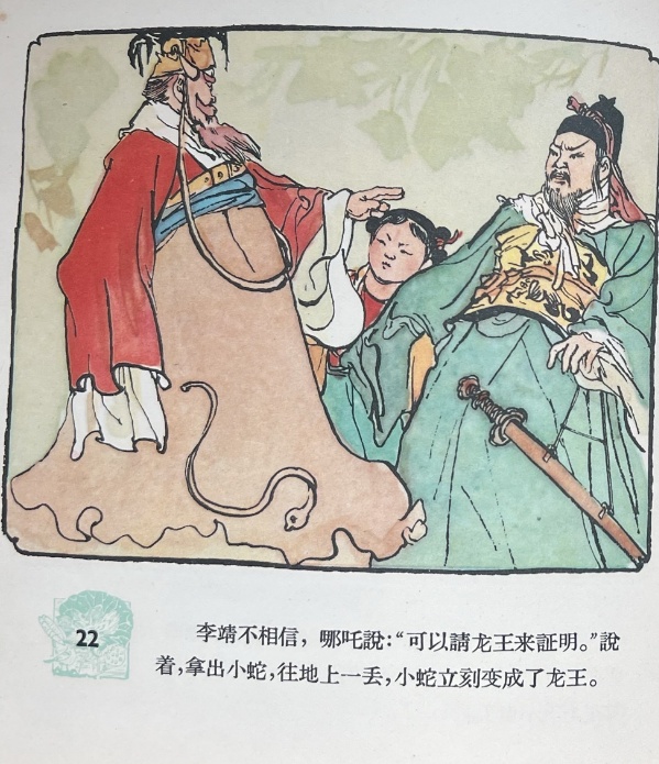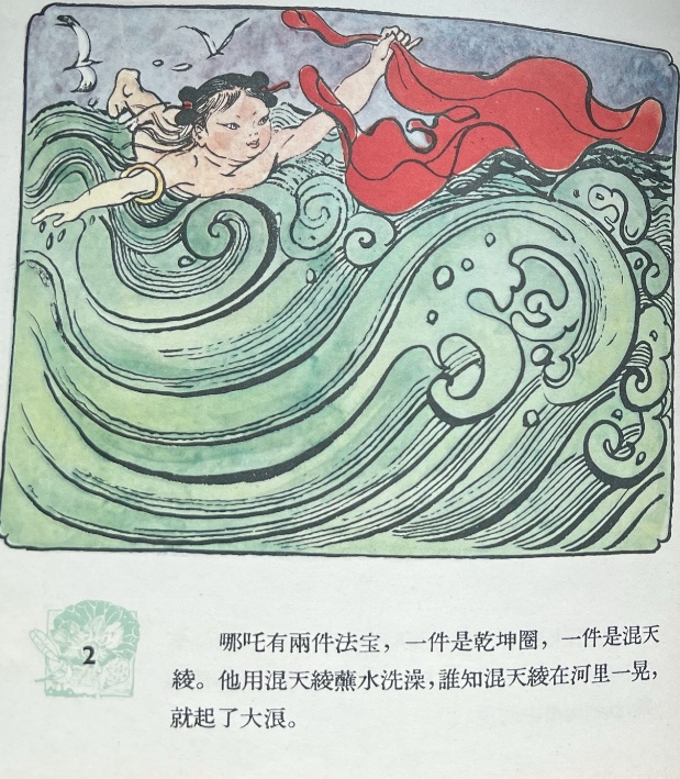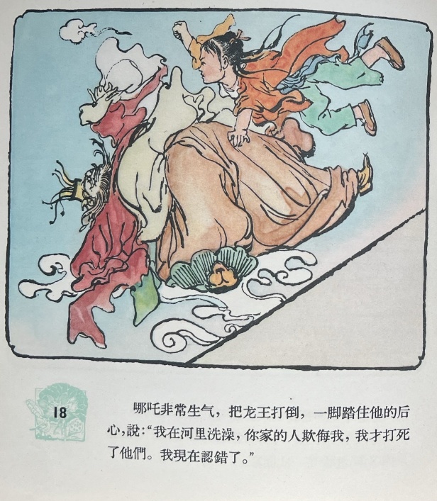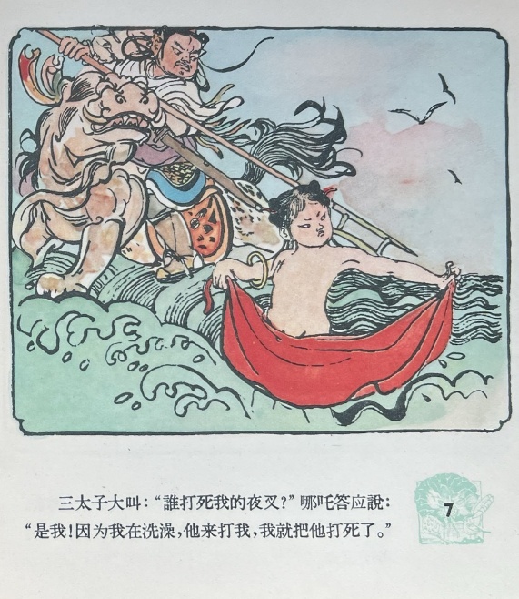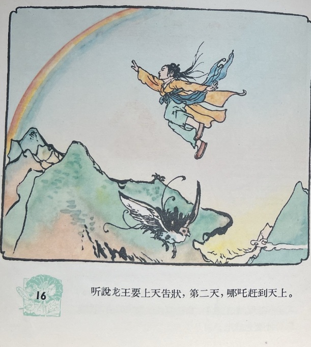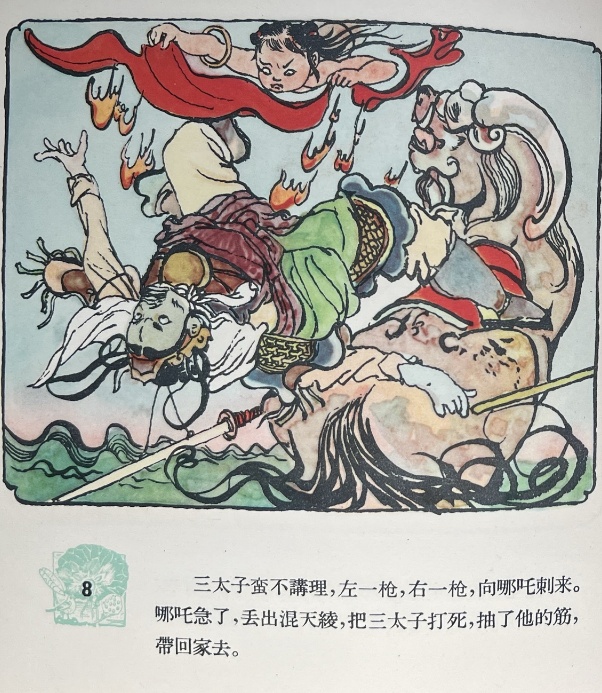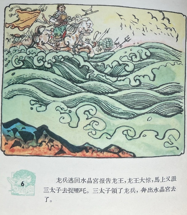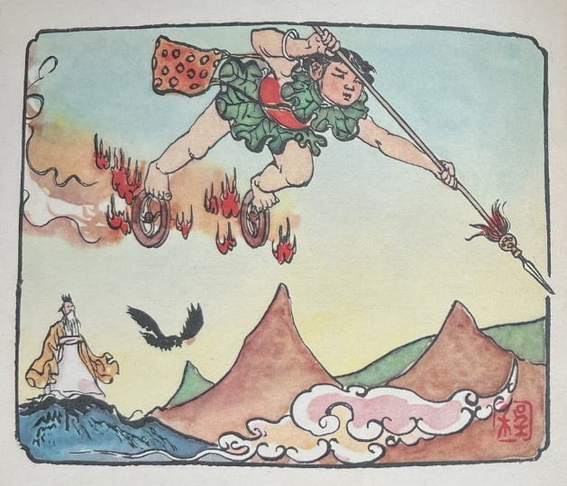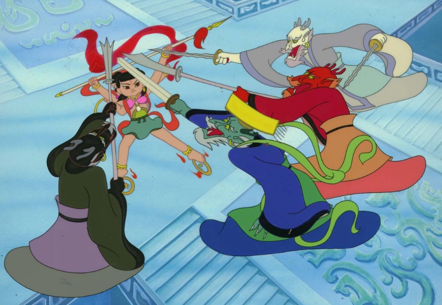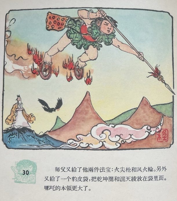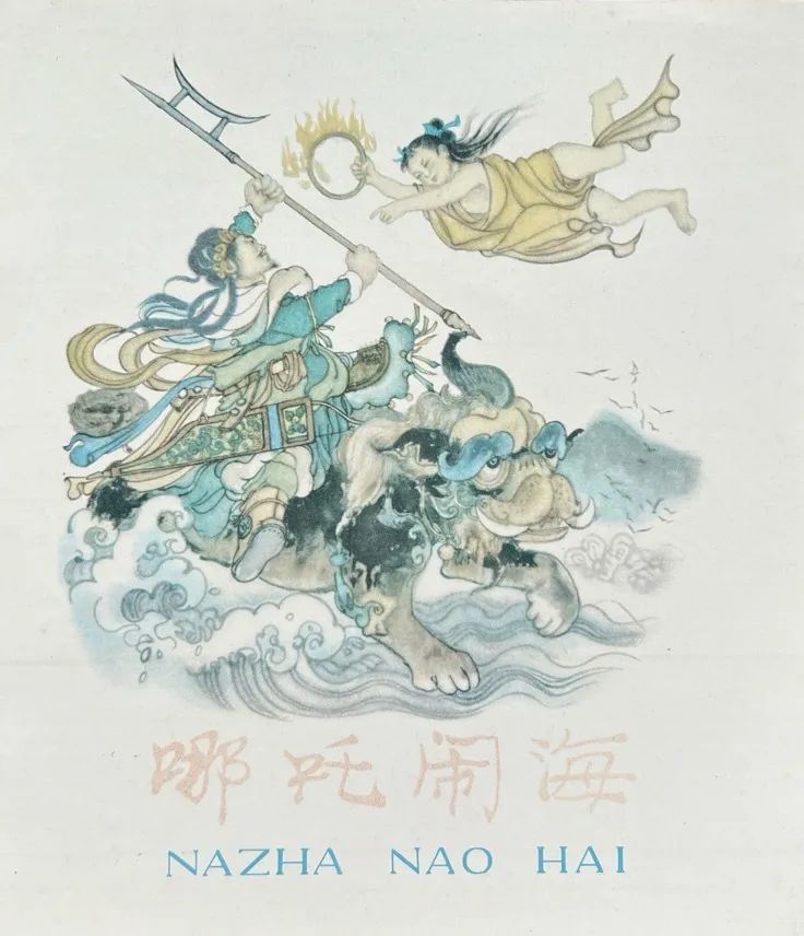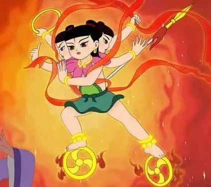 这版哪吒圆润可爱,拥有三头六臂,脚踏风火轮,手持火尖枪,臂挽混天绫,法力高强。