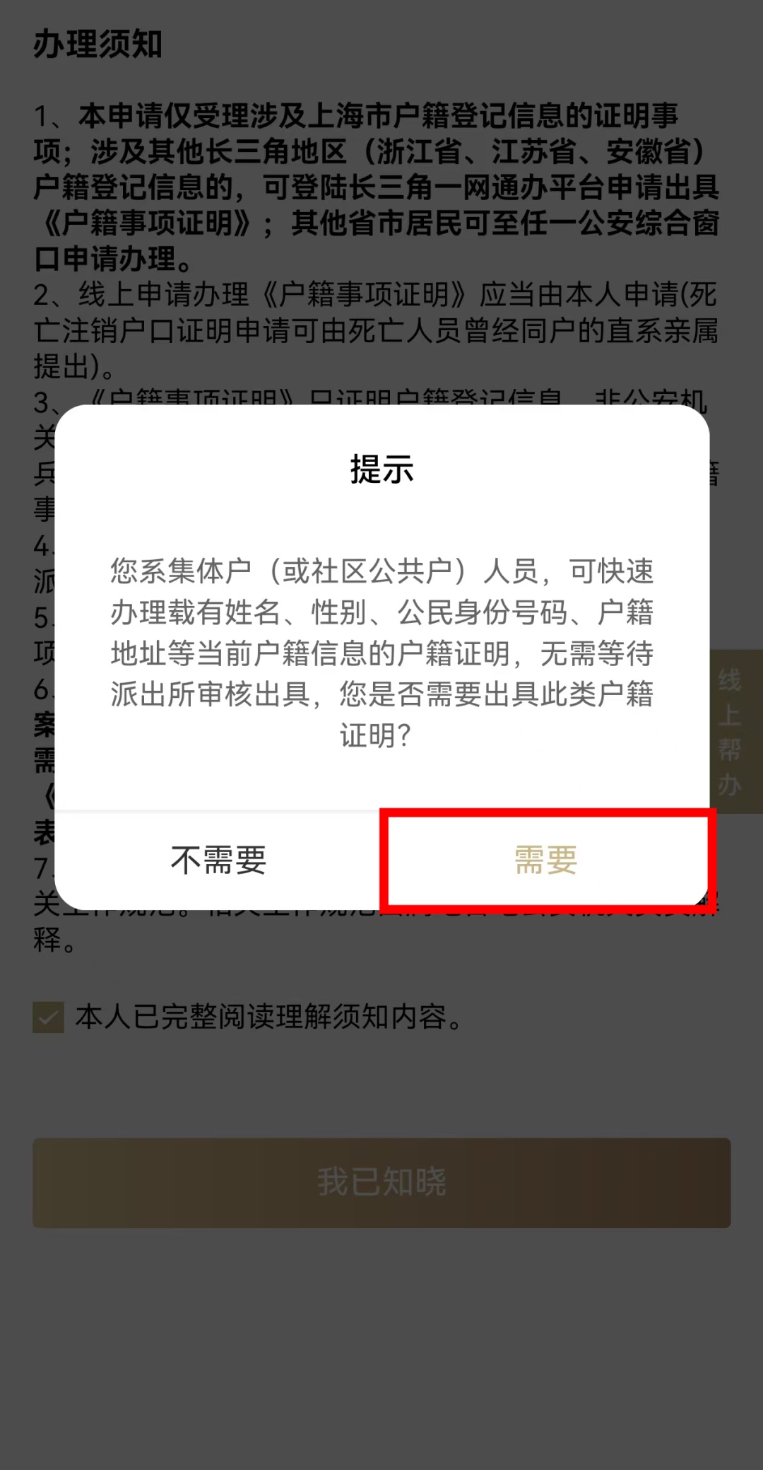 1.搜索“户籍事项证明”,点击进入,进入后弹出“您系集体户……”提示,点击“需要”