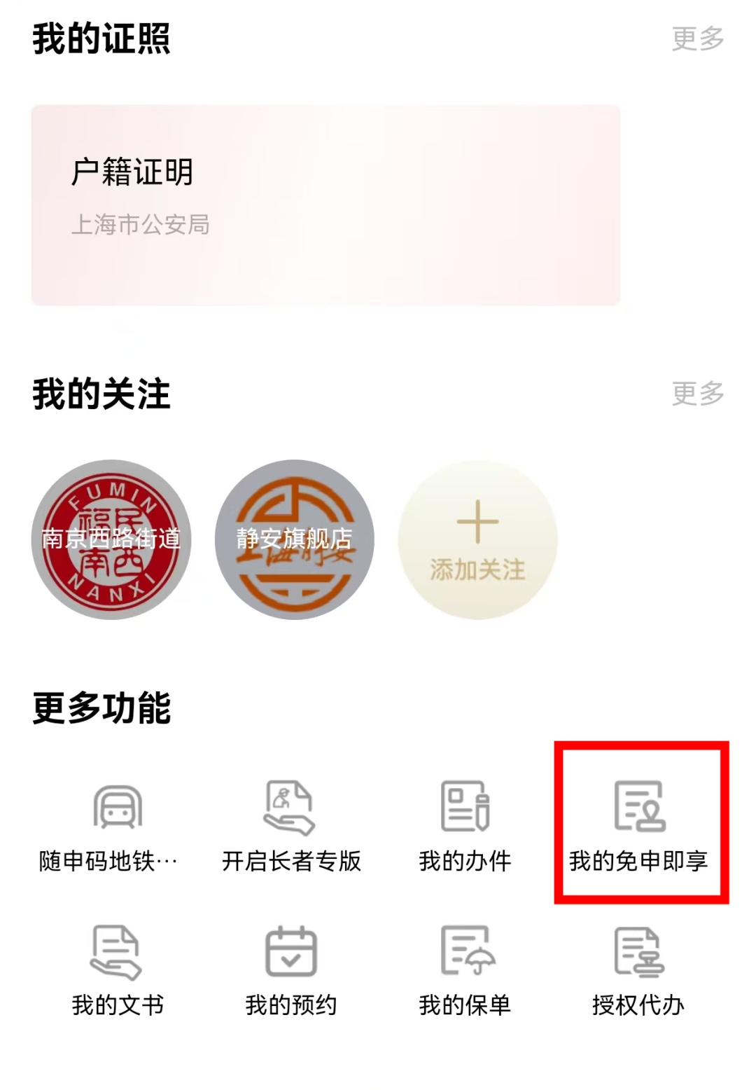 2.点击“更多功能”栏目中的,我的免申即享”即可查看。
