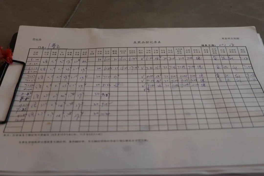 顾欣说,在东泰祥,每一锅生煎都有自己的“身份证”。他请服务员拿出一份《生煎品控记录》,这里面详细地记录了每锅生煎的打面时间、打面人员、面粉分量,甚至还有室内温度、水温温度、醒发时间等,精确得犹如实验室里的实验记录。顾欣说,虽然记录这些信息很琐碎,但只有这样,一旦生煎出现问题,才可以凭着这份记录找到问题的根源。