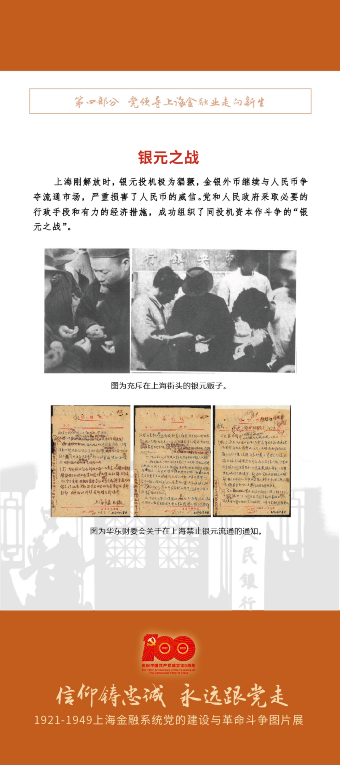 1949年6月上旬,“银元之战”打响。上海市军管会发布命令禁止外币、金银币的流通,同时取缔黑市,打击各类投机活动。6月10日上午,军管会包围并查封了当时作为银元投机中心的上海证券大楼,并逮捕投机倒把的首要分子,沉重打击了银元投机浪潮。与此同时,政府对市场交易进行严格监督,打击地下钱庄。在各种措施的共同作用下,银元价格暴跌,人民币迅速占领市场,党和人民政府在“银元之战”中获得胜利。