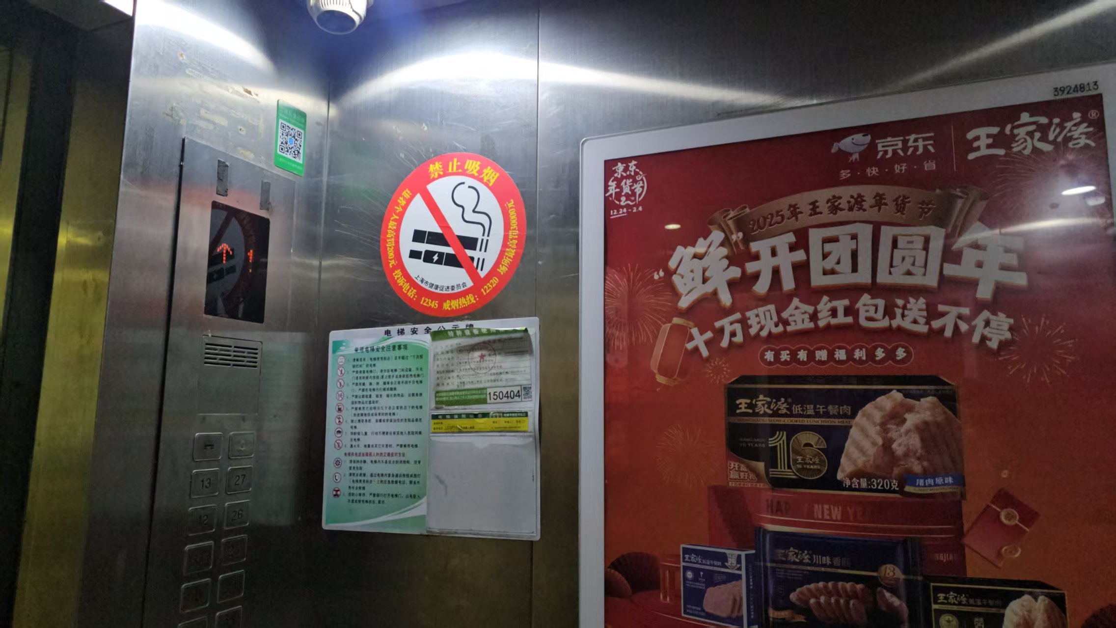 执法队员找到投诉的楼栋,实地了解被投诉的电梯内部情况。经现场查看,队员们在电梯厢房及楼道墙壁上都看到了明显的禁烟标识。