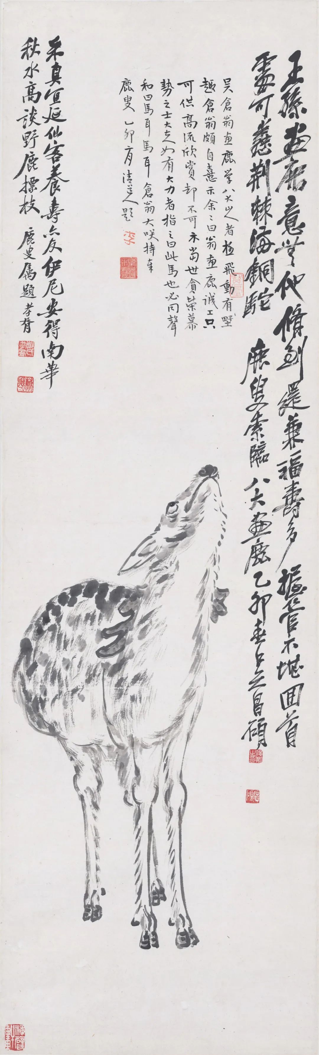 《白鹿图》又名《临八大山人鹿图》,为吴昌硕七十二岁时拟八大山人笔法所作。画中白鹿白眼向天的神态正是八大山人笔下动物最典型的神态特征。粗重的墨点突显了鹿骨之矫健,短轻的勾勒画出了皮毛之轻盈,形成水墨语言的变化与对比,足见吴昌硕晚年在笔墨驾驭上的老到功力。