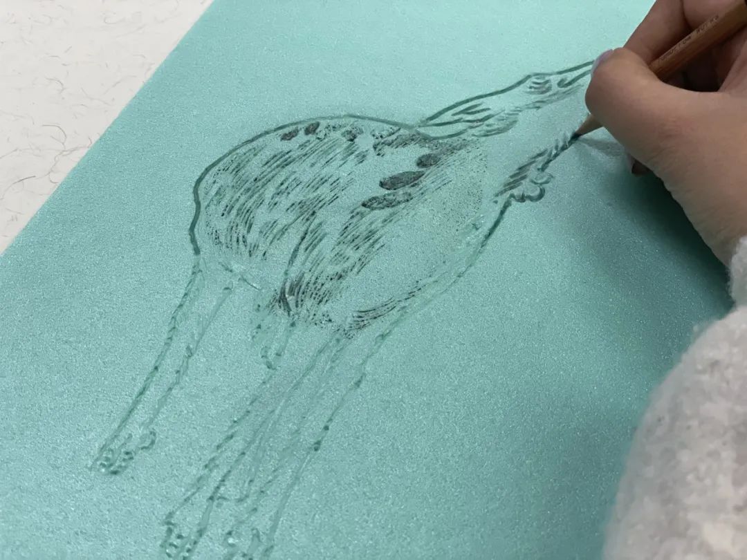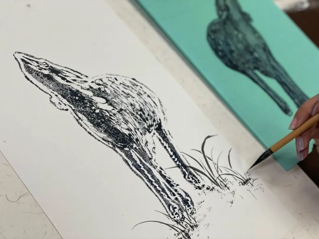 本期吴昌硕绘画艺术工作坊,我们将版画与国画结合,在吹塑板上刻出这幅《白鹿图》,尝试刻画出鹿的皮毛质感,拓印之后可再以水墨点缀石头或花草,体会版画与水墨相互碰撞的趣味。
