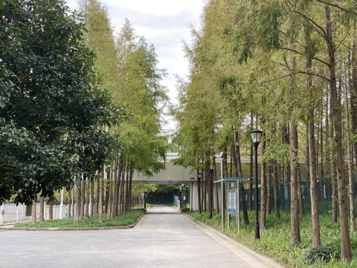 闸区内环境整洁,周围高耸挺拔、郁郁葱葱的杉树环绕其间,营造出一片宁静清幽之境。杉树能够防止水土流失,保持土壤的稳定性,树冠能够遮蔽强烈的阳光。泵闸与绿树共同塑造城市生态形象,守护前滩地区水域的和谐与稳定。