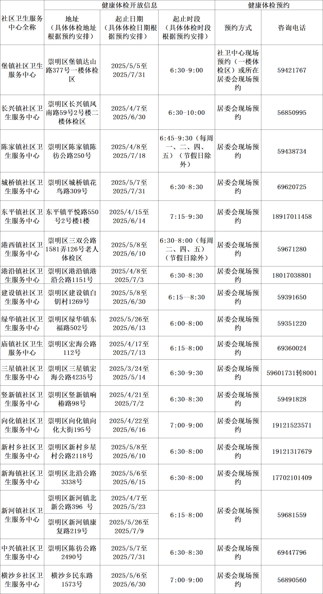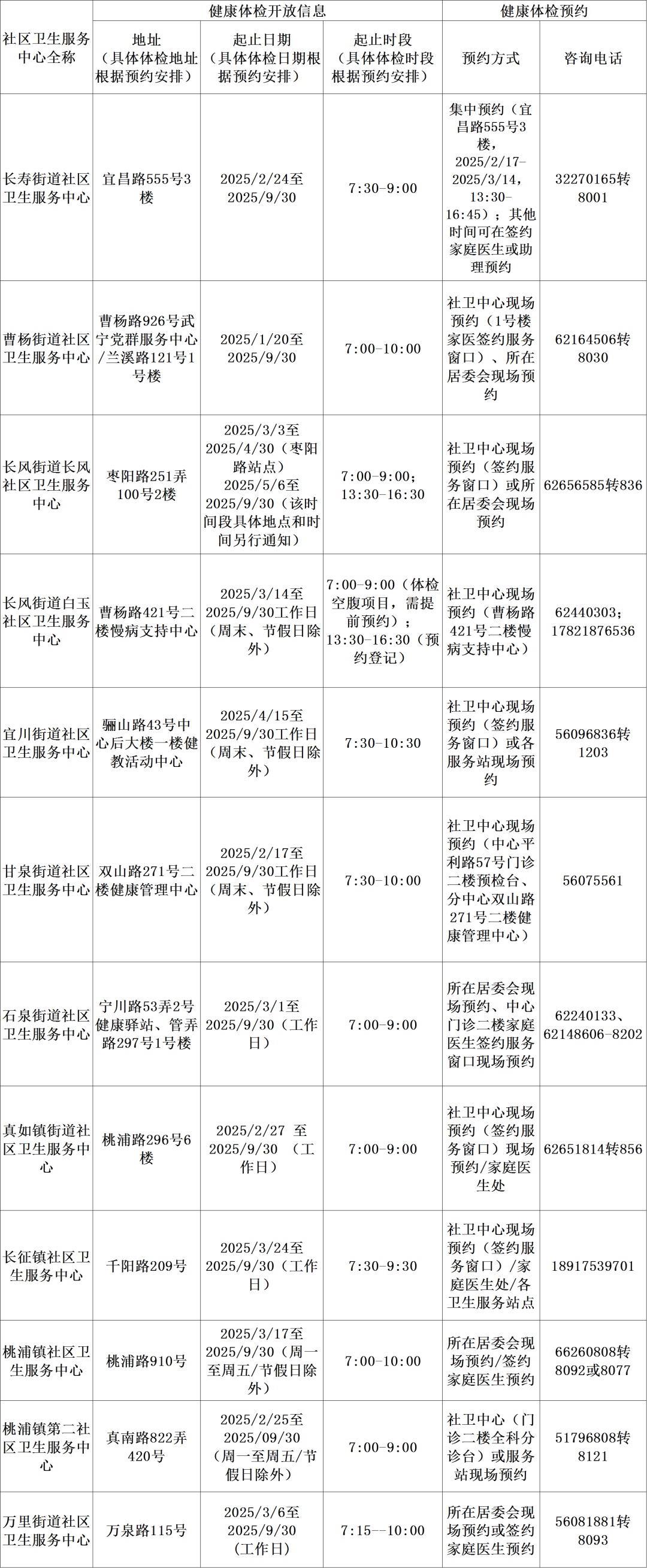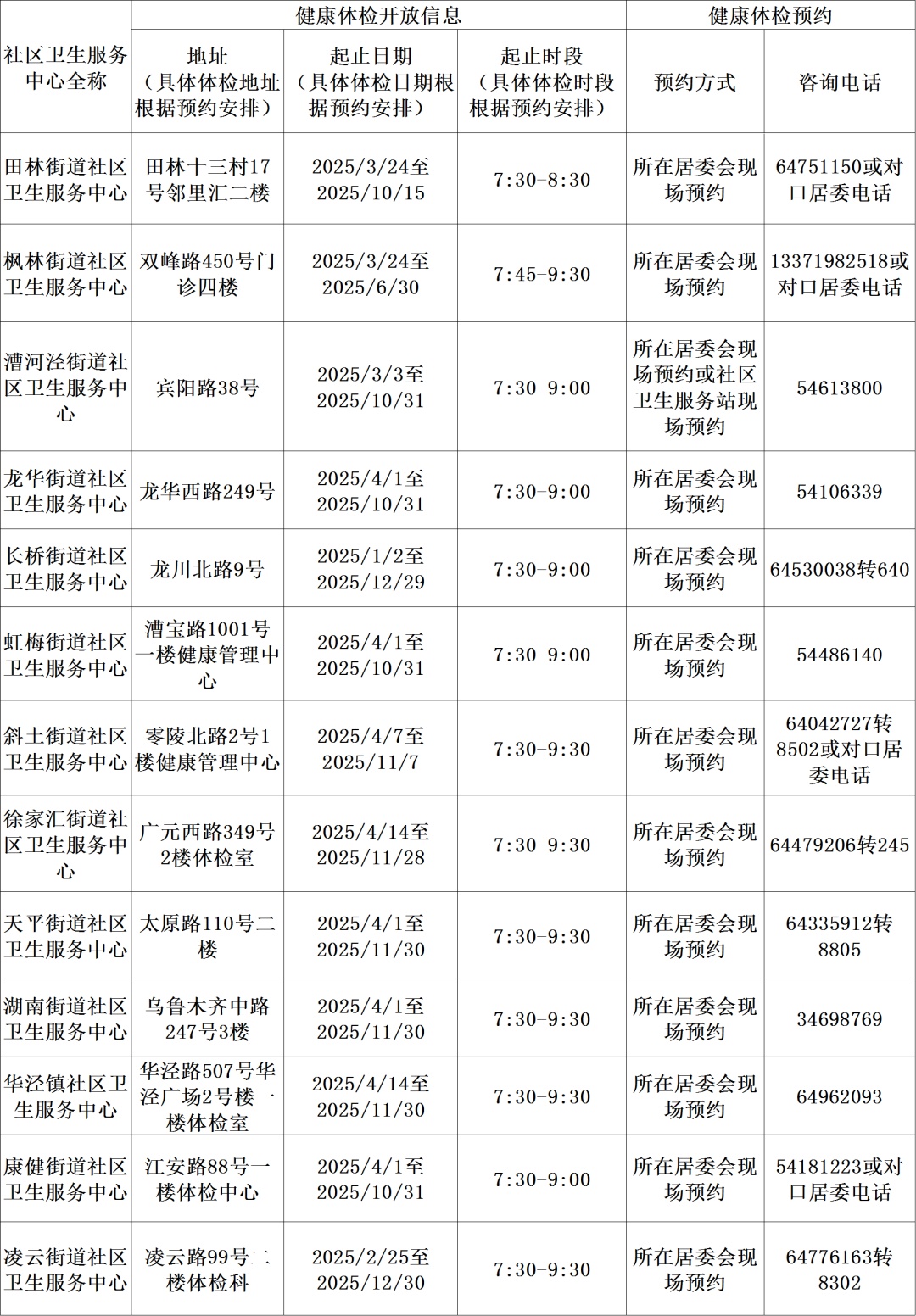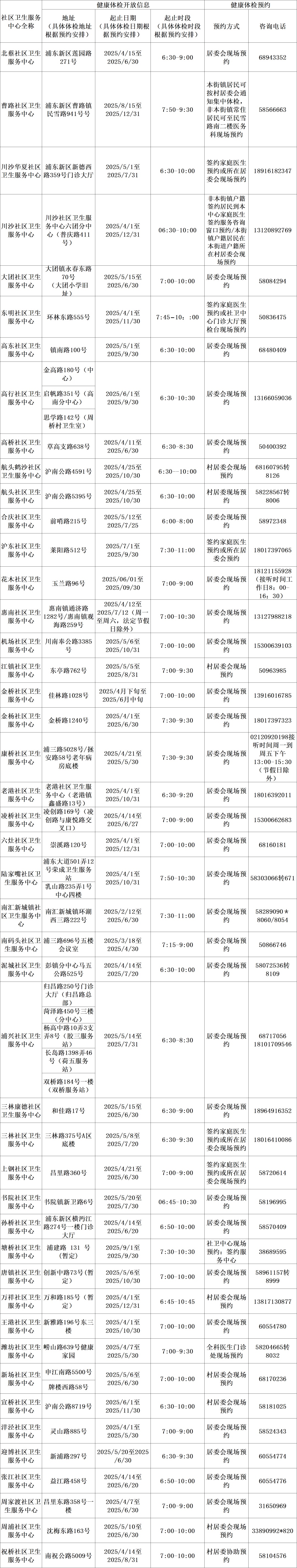 免费健康体检信息一览表(2025年)