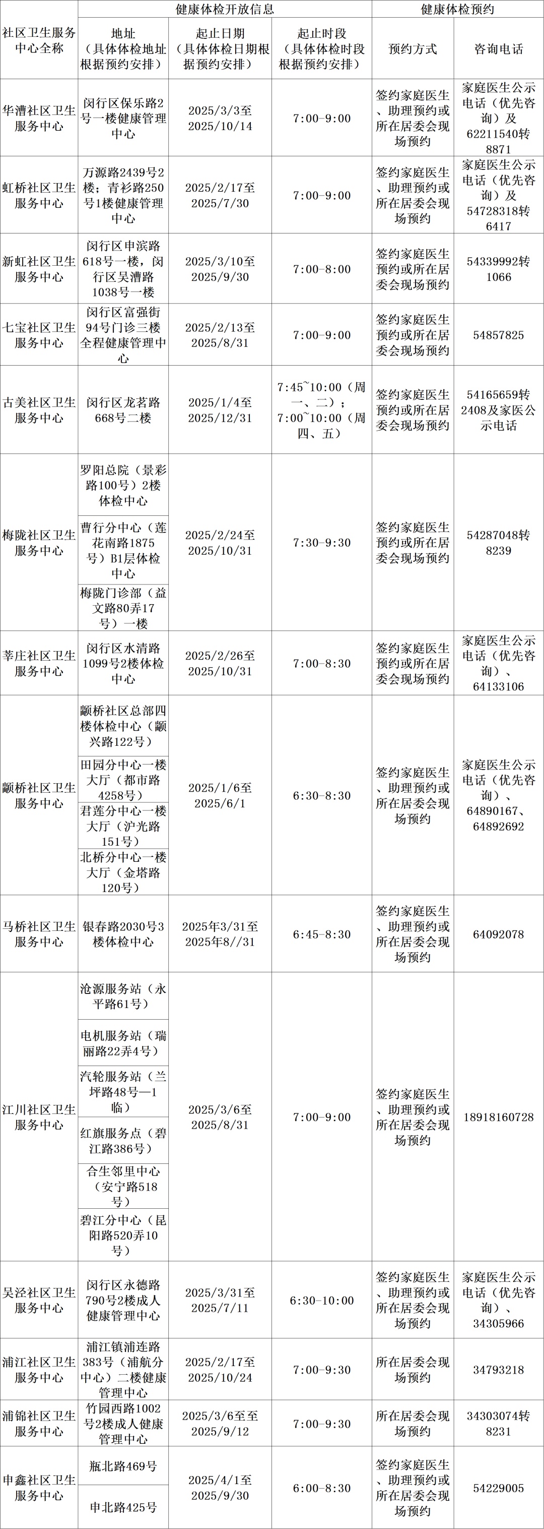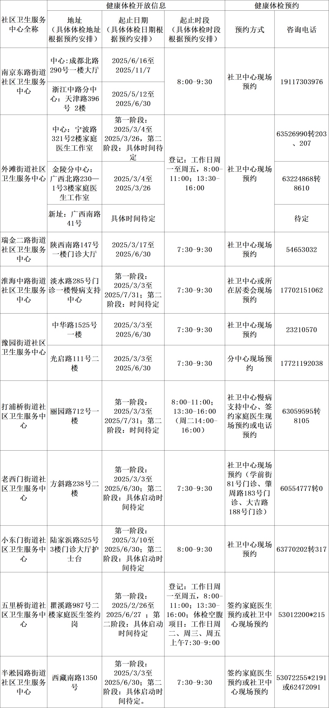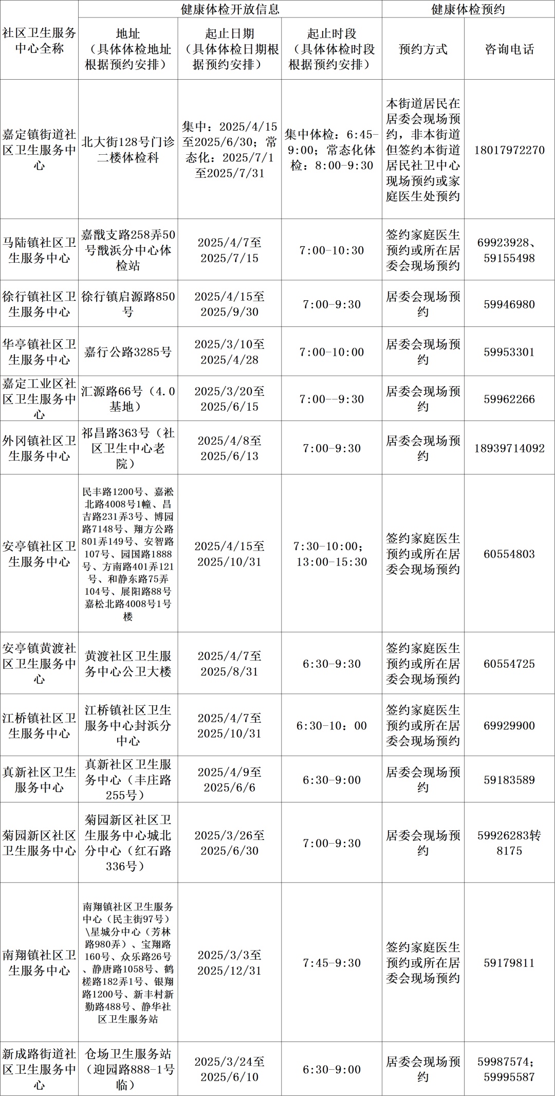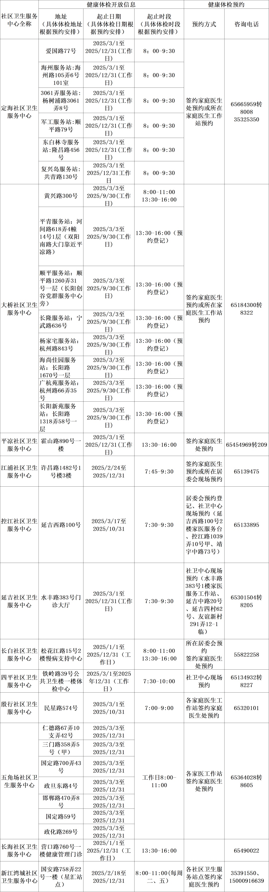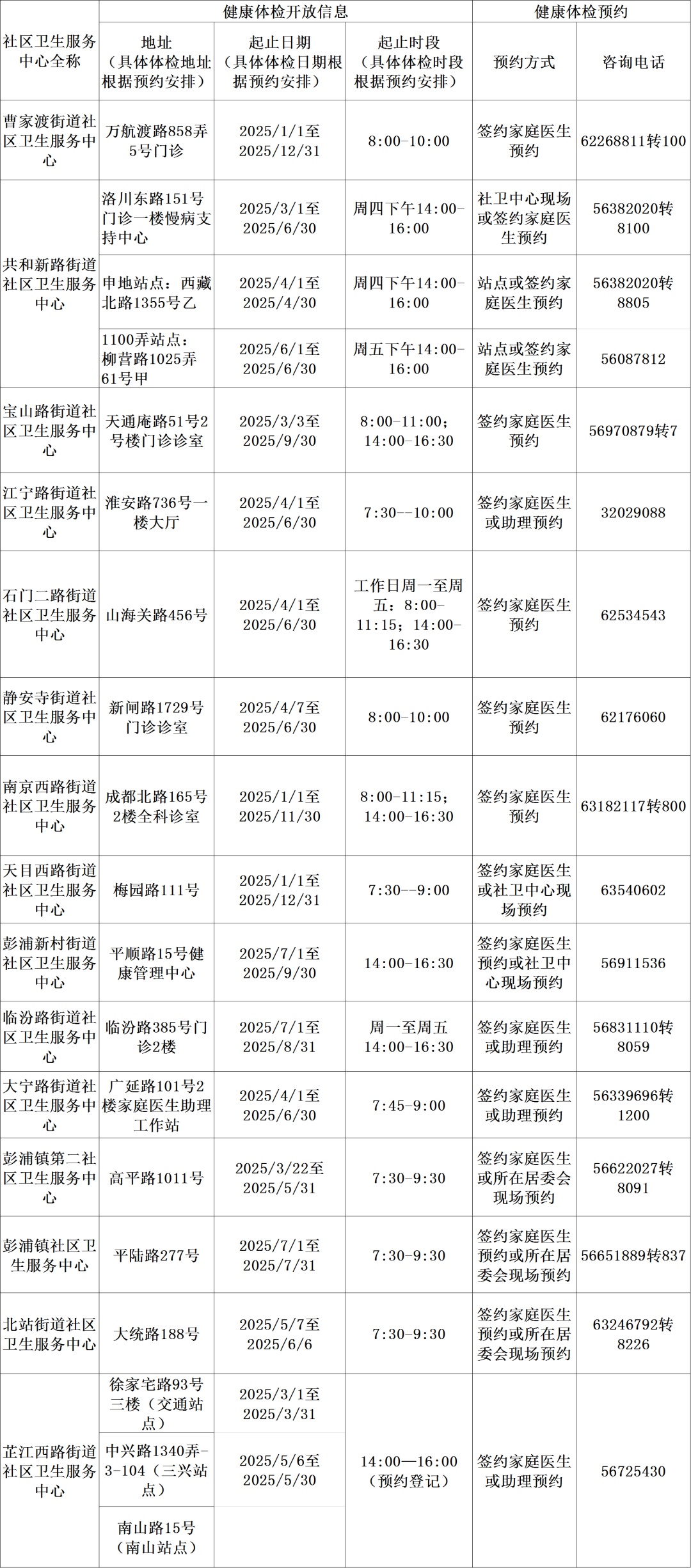 免费健康体检信息一览表(2025年)