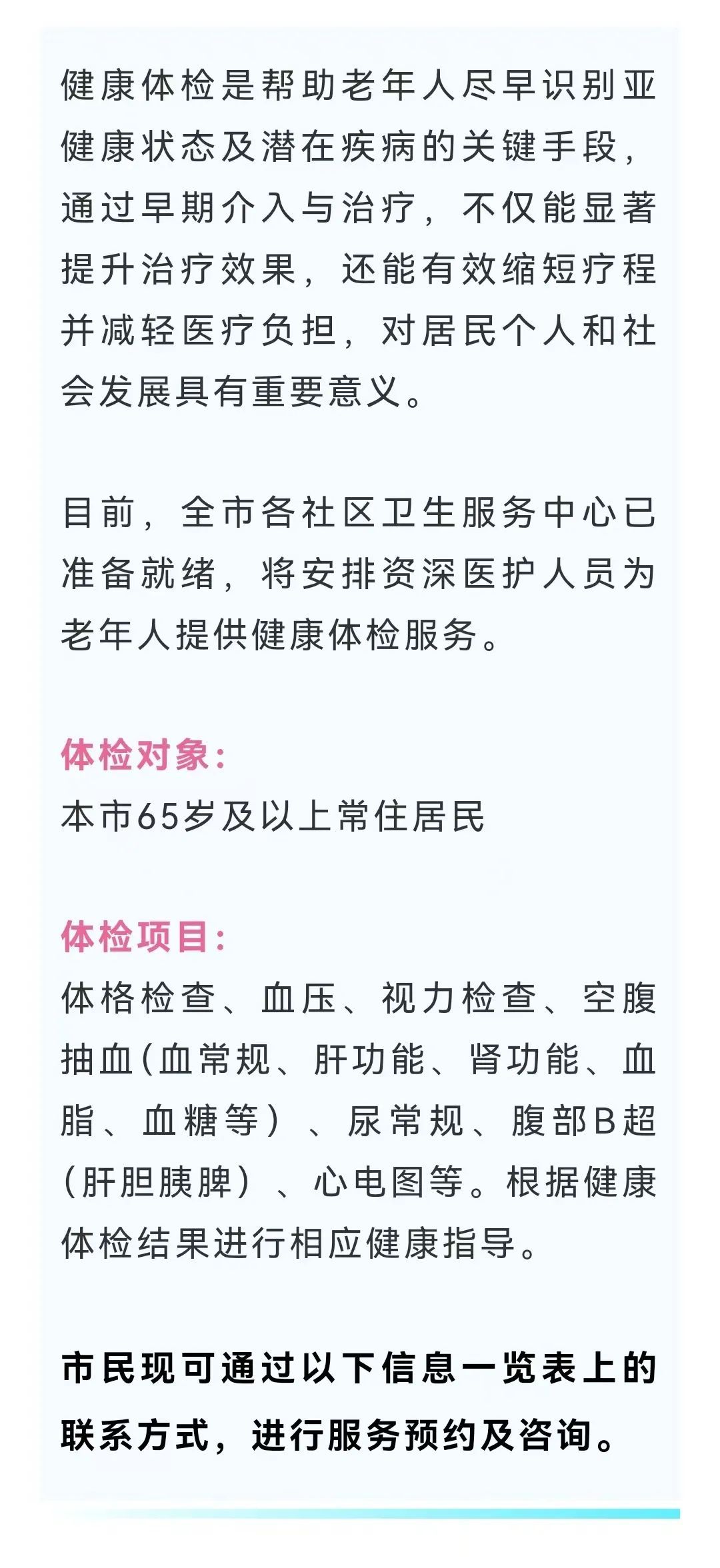 市卫健委介绍,为进一步提升上海市老年人群的健康水平,更有效地做好老年人健康管理,全市246家社区卫生服务中心为辖区内65岁及以上常住居民,每年开展健康管理服务。内容涵盖生活方式和健康状况评估、体格检查、辅助检查和健康指导等,为每位老年居民提供专业的健康关怀和健康指导,服务信息公布如下↓