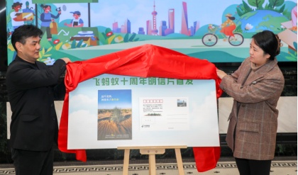 活动现场还发布了一款特别的环保主题明信片。这批明信片由上海邮政与本土环保回收平台“飞蚂蚁”联合制作,采用可再生纸张,传递循环利用、绿色发展的理念。市民在邮政网点参与旧物回收后,可用回收所得兑换这款明信片,进一步感受环保的价值。