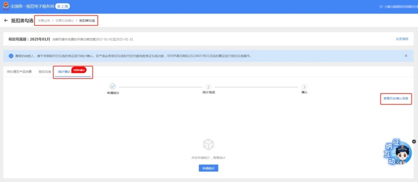 温馨提示:如需查询往期的抵扣勾选信息,可以依次点击新电子税局首页【发票业务】-【发票勾选确认】-【抵扣类勾选】-【统计确认】进入功能页面。【统计确认】界面如图所示: