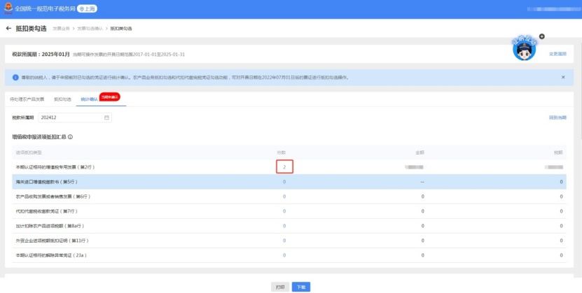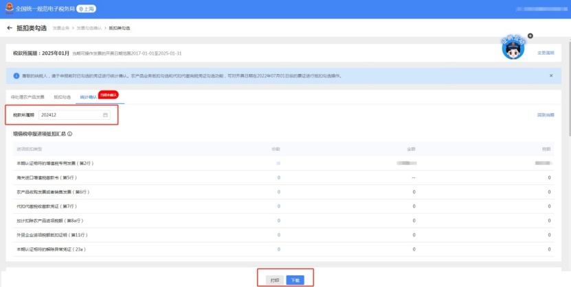 点击页面右上方的【查看历史确认信息】,选择税款所属期后即可查看。例如纳税人目前税款所属期为1月,可选择12月及以前的所属期,即可查询统计结果。如需打印或导出发票统计表可点击下方“打印”/“下载”按钮。