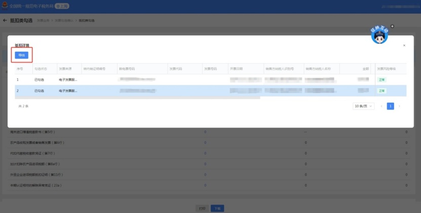 小贴士:点击蓝色数字可查看此类发票抵扣详情,点击【导出】可获取该发票清单。
