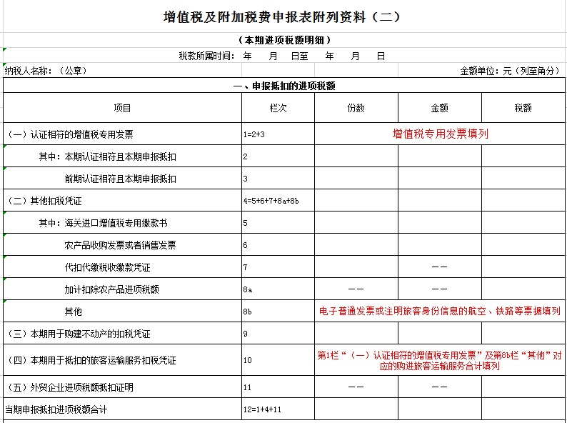 二、一般纳税人购进国内旅客运输服务,取得增值税电子普通发票或注明旅客身份信息的航空、铁路等票据,按规定可抵扣的进项税额,在申报时填写在《增值税及附加税费申报表附列资料(二)》第8b栏“其他”中。