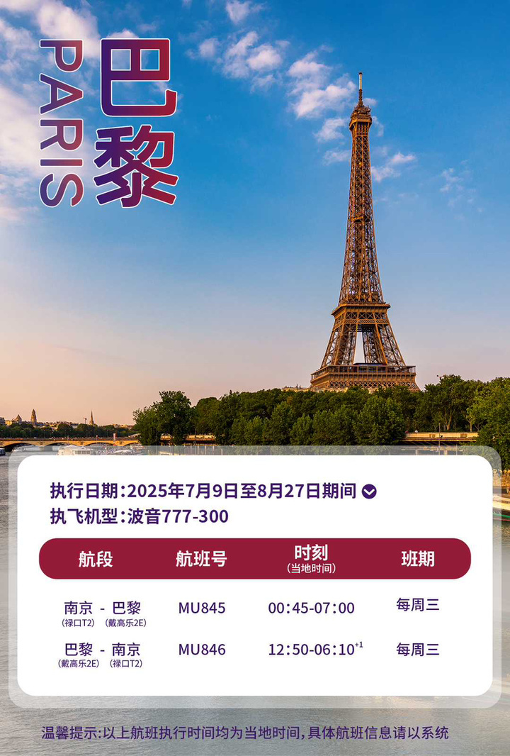 据了解,新航线将采用波音777—300机型执飞,班期为每周三,具体航线信息如下:南京(禄口t2)—巴黎(戴高乐2e)航班号为mu845 ;巴黎(戴高乐2e)—南京(禄口t2)航班号为mu846。