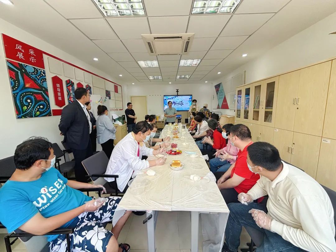 学员集体生日会温馨的氛围感染着每一个人:残联工作人员与共建单位的志愿者们一起为阳光家园的学员们布置了充满惊喜的生日现场。面点师手把手教授学员亲手制作简易奶油蛋糕;在庆生环节中,3位在4—6月内过生日的学员在现场的祝福声中闭上眼睛许下心愿,随后一起吹灭蜡烛。