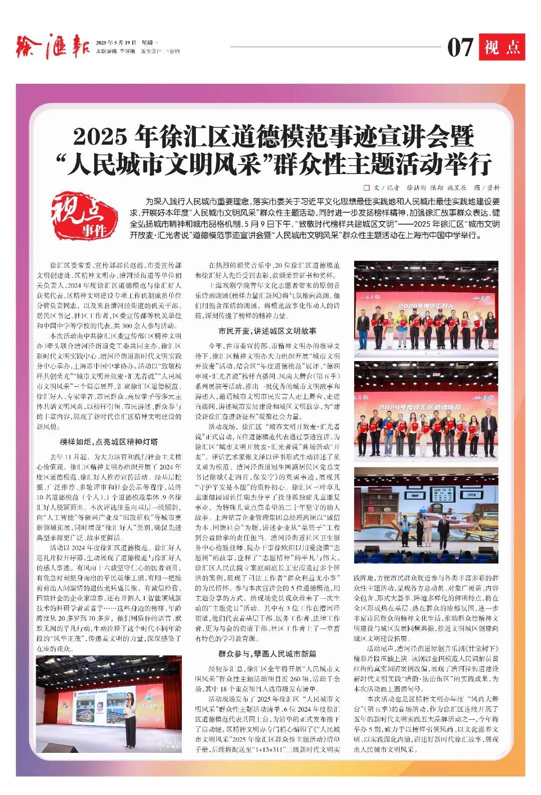 2025年徐汇区道德模范事迹宣讲会等活动中,道德模范们平凡动人的事迹,点亮城区“精神灯塔”,照亮城市文明之路;市民代表走上讲台“开麦”,分享身边的文明细节与温暖瞬间;广大群众积极参与,以实际行动共同擘画人民城市共建共享的崭新篇章。这场充满温度与力量的活动,不仅凝聚起榜样引领的精神合力,更让“人民城市文明风采”在基层展示蓬勃生机。