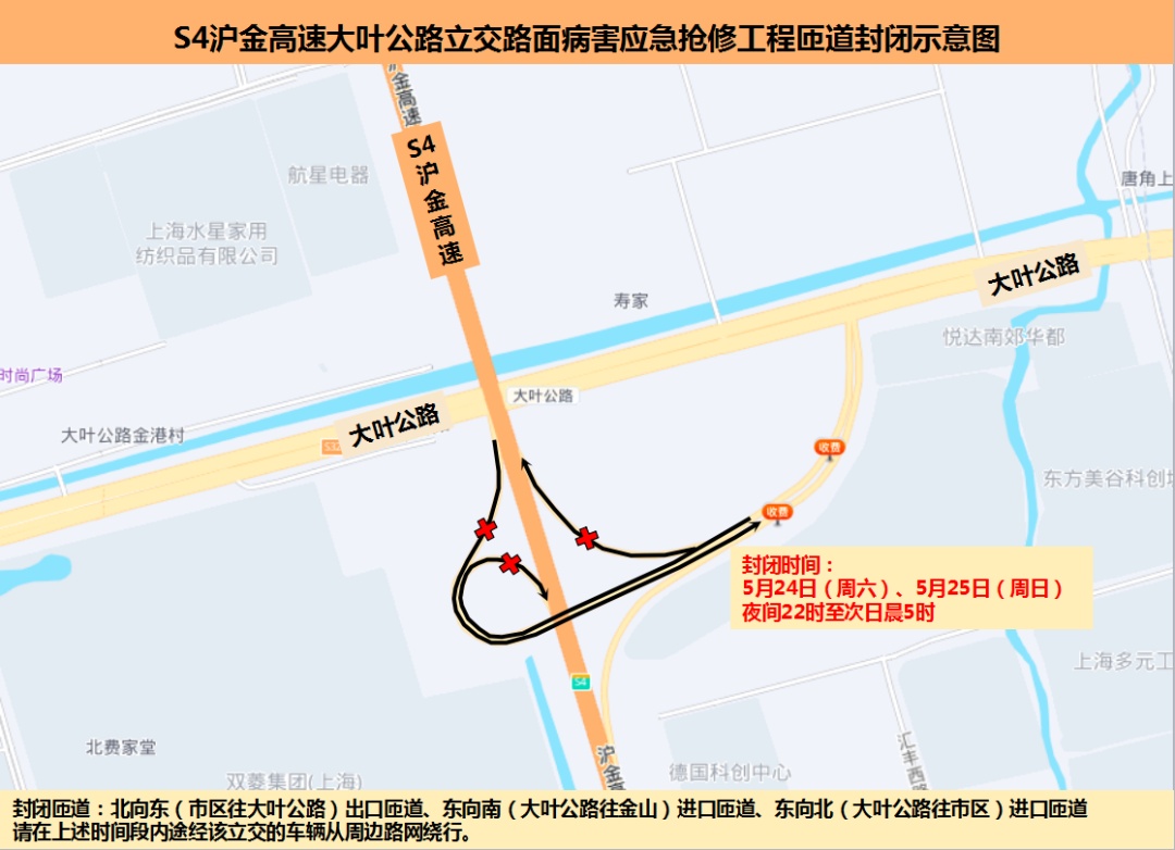 为配合s4沪金高速路面病害应急抢修工程施工,5月24日(周六)和5月25日(周日)夜间22时至次日晨5时,对s4沪金高速大叶公路立交北向东(市区往大叶公路)出口匝道、东向南(大叶公路往金山)进口匝道和东向北(大叶公路往市区)进口匝道实施全封闭施工。提醒在上述时间段内途经该立交的车辆从周边路网绕行。