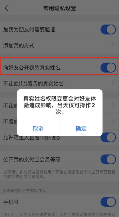 一些网友想要关闭支付宝好友真实姓名显示,隐藏真实姓名。支付宝支持此设置(我的→右上角“设置”图标→用户保护中心→常用隐私设置→关闭“向好友公开我的真实姓名”),设置后支付宝会提示“真实姓名权限变更会对好友体验造成影响,当天仅可操作2次”。