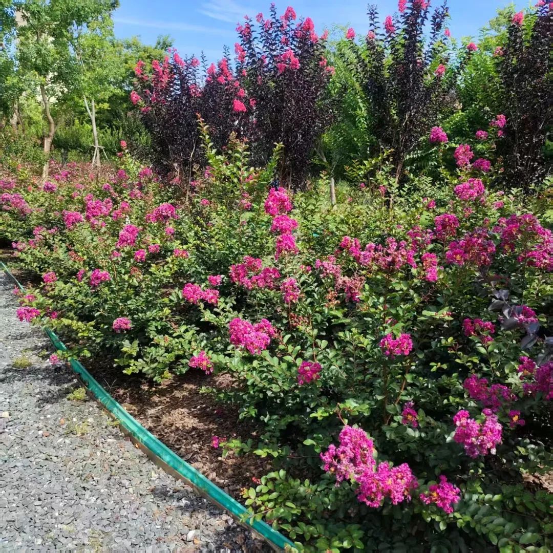 园内90%的紫薇品种是由国内企业自主培育生产,主要有‘夏日舞娘’、‘少女芯’、‘紫贵妃’、‘英红田园’、‘巧克力’、‘午夜’等18个品种。仅‘马斯科吉’和‘天鹅绒’来自美国。