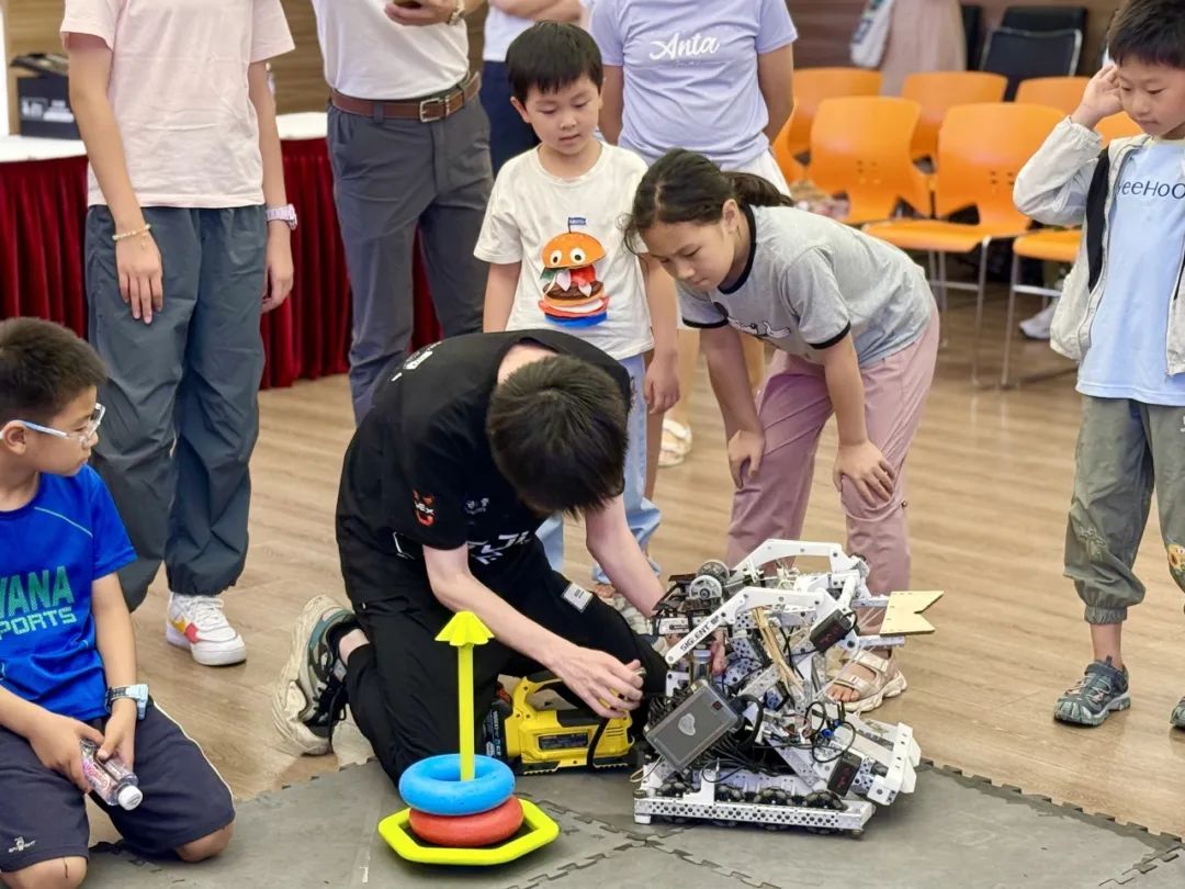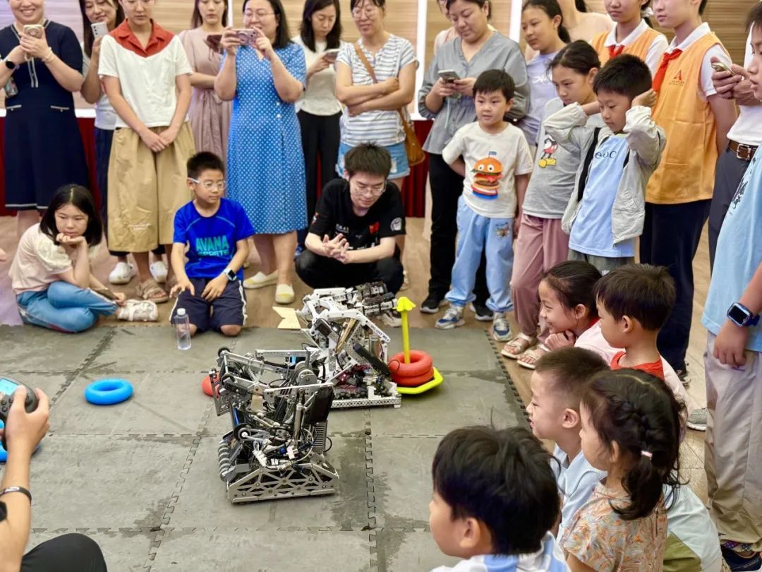 在团队成员的操作下,活动现场瞬间变身科技秀场。只见这些融合人工智能的机器人灵活穿梭,精准定位设备让它们如同拥有“火眼金睛”,高算力平台赋予它们“最强大脑”,智能通信系统则让它们化身“默契搭档”。当团队队长播放vex2024-2025赛季比赛视频时,大屏幕上机器人行云流水般的操作引得观众席发出阵阵惊叹。其中一位小朋友激动地说:“太厉害了,一会有机会的话我也想试一试!”