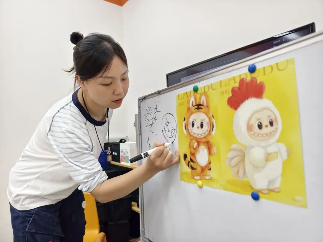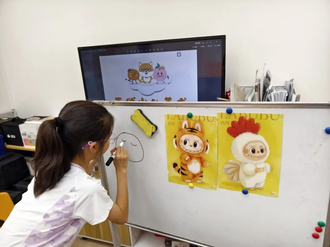 张同学通过举手抢到了第一个上场一试身手的机会,她属猴,因此选择画一幅labubu风格的猴子生肖图。此前,老师通过画老虎、画公鸡,给小朋友们传授了labubu风格生肖画的技巧。