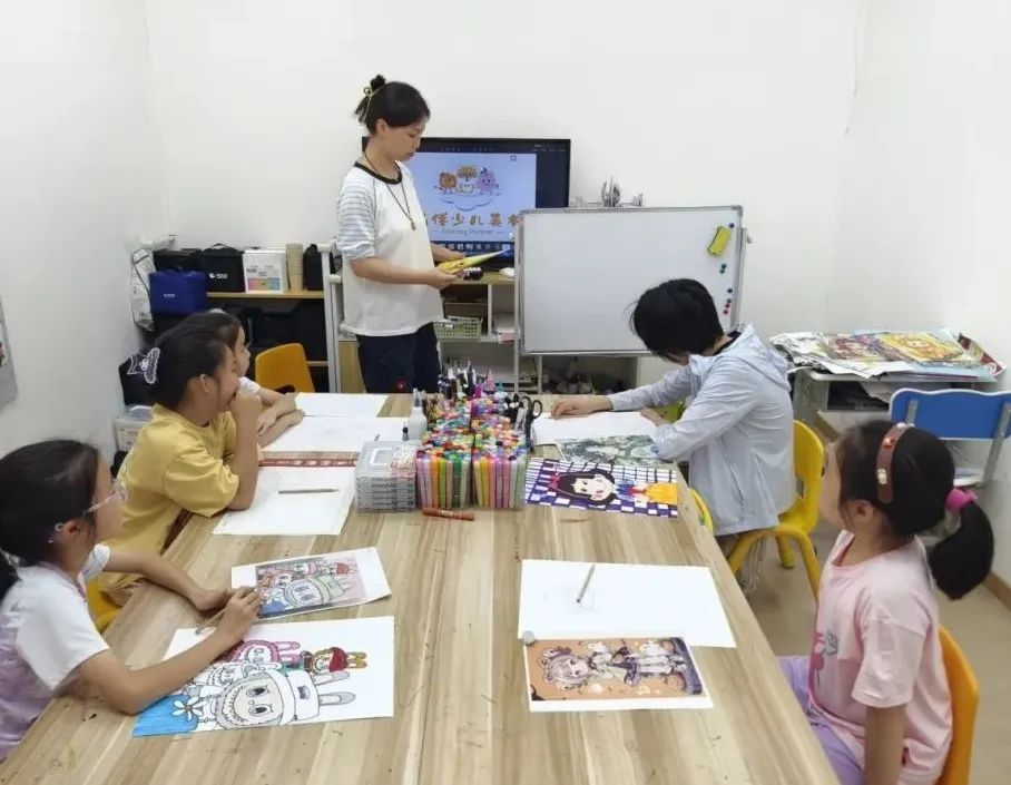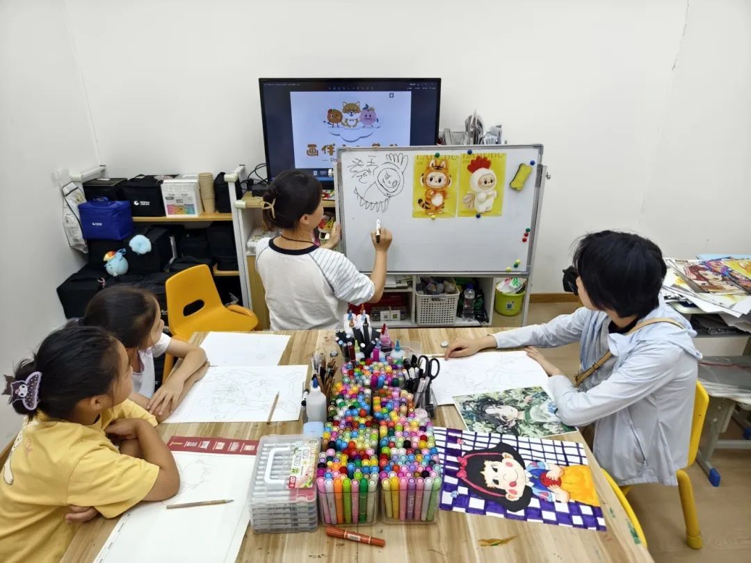 男生爱篮球,女生爱画画。在二楼的另一个区域,是一个少儿美术训练营。在监护人的带领下,一些女孩来到这里学画画。美术老师选择了当下颇为流行的labubu玩偶画像作为小朋友们绘画入门的第一步,通过兴趣引领、先易后难,让他们走进美术的殿堂。