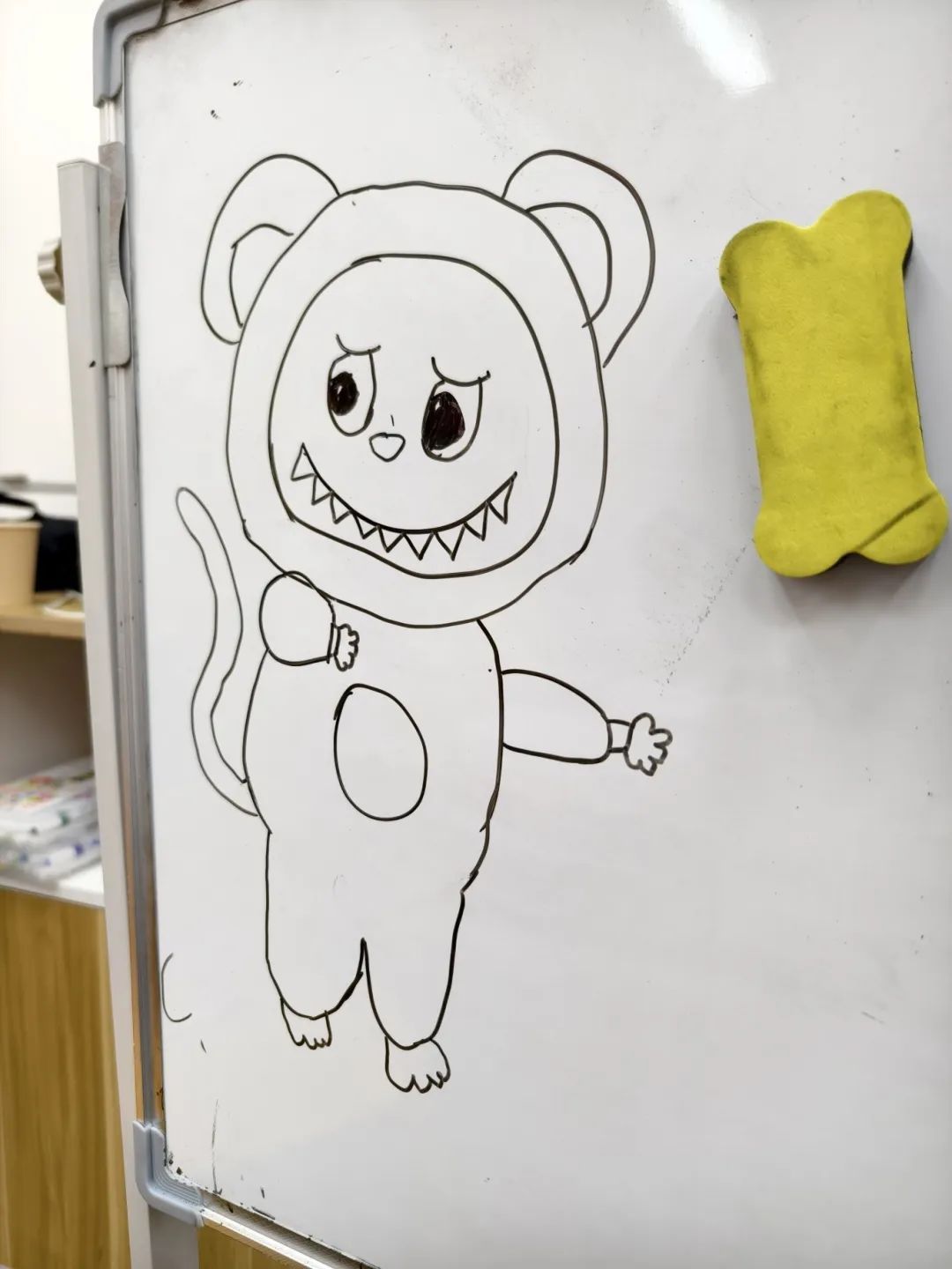 张同学的作品得到了老师和小朋友们的肯定,老师还帮她指出了美中不足的地方,并把这只labubu生肖猴的尾巴改进成了卷曲型的,增加了画作的“猴性”。