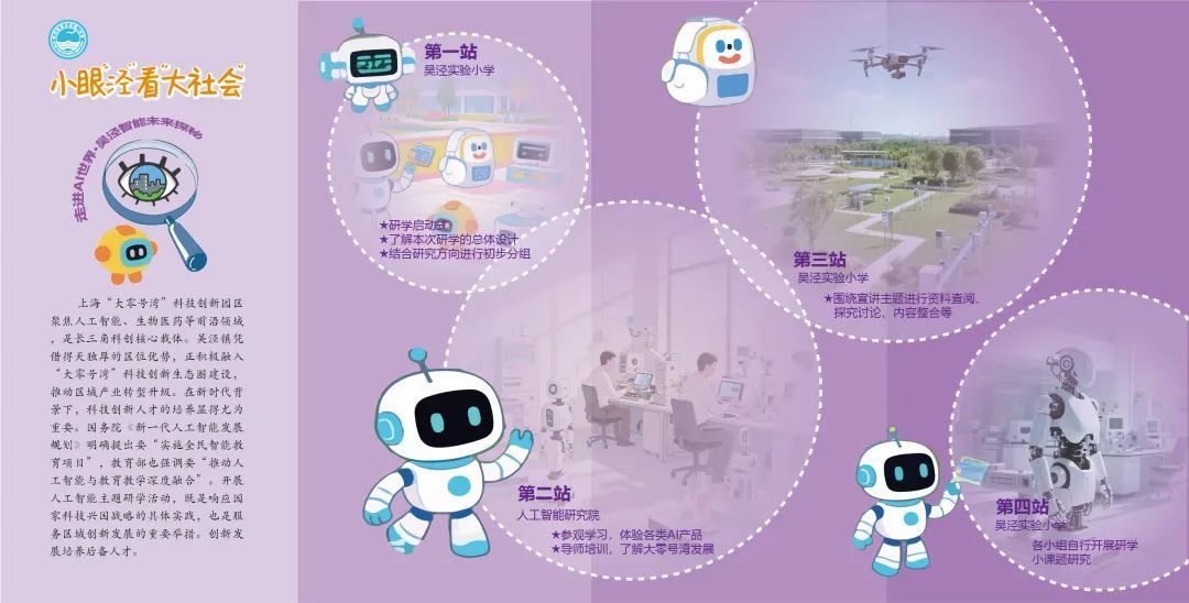 除了与大自然亲密接触的绿色线路,翻开研学手册,还可以看到学校针对三到五年级学生设计了探秘吴泾工业发展与变迁的红色之旅;策划了聚焦“大零号湾”人工智能前沿科技的紫色路线,串联起了吴泾地区“大空间、大课堂、大先生、大教材”等要素。