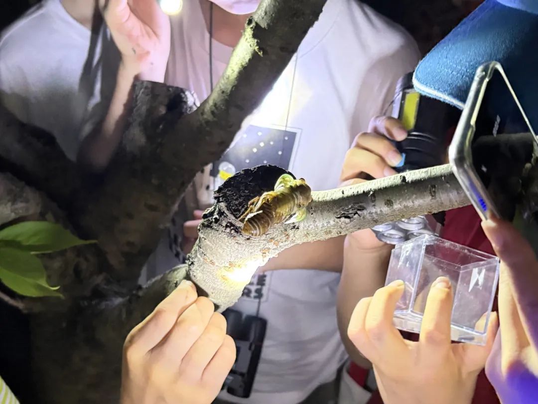 几个孩子立刻举起手电筒,把停在树干上的蝉团团围住,还互相提醒着,要保护好这只蝉。其中,一位男生还拿来了一个透明的小盒子,想要把蝉蜕接住。