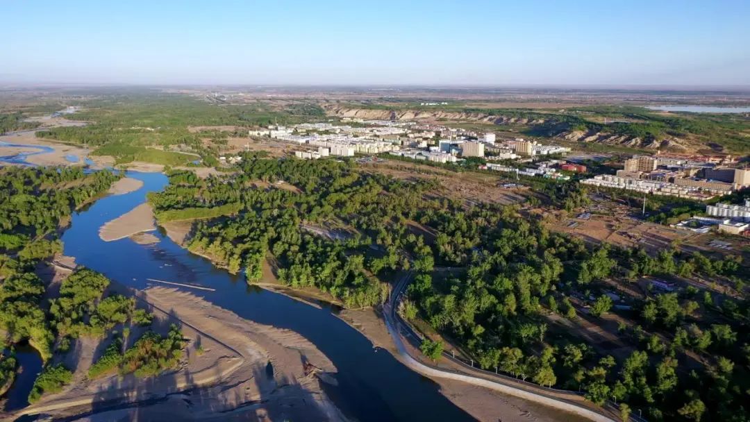 坐落在额尔齐斯河畔得仁山脚下的年轻美丽的军垦新城北屯市。清澈的额尔齐斯河,穿过北屯市的城北,沿西北方向奔涌而去。(图:新华社)