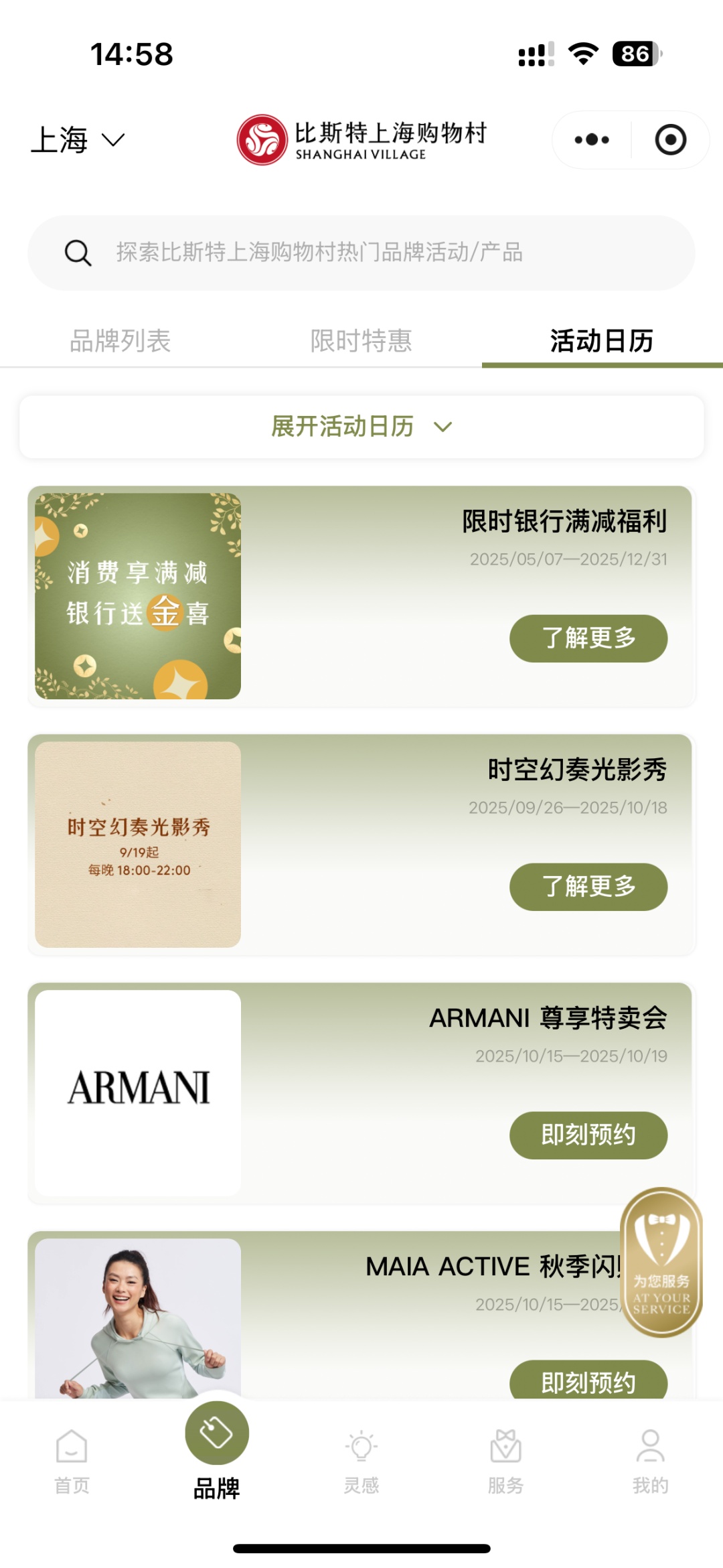 “活动日历”集合了购物村内各项活动,并提供在线预约。消费者不但可以第一时间掌握新店开业的消息,每天还有不同品牌的会员尊享闪购活动,换季的日子有当季上新预览会。抓住拥有比斯特上海购物村的活动日历,不但拥有抓住了时尚潮流,更满满牢牢拥有抓住了获得最超级优惠满减的福利。